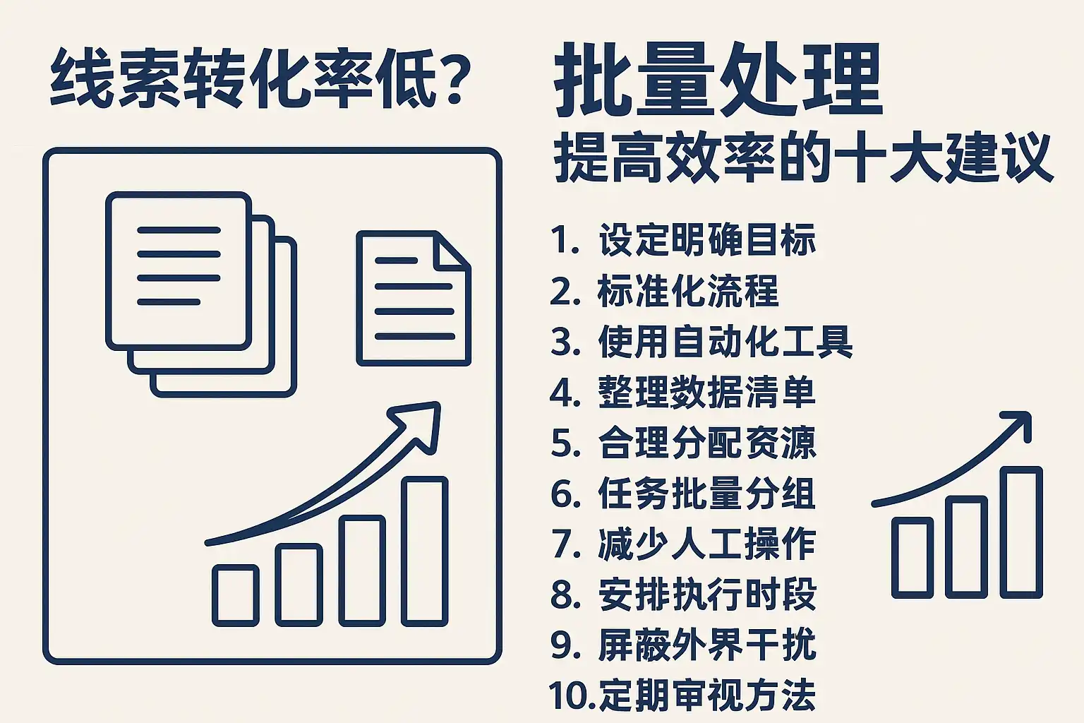 - 批量提效的底层逻辑是标准化+自动化+数据闭环;清洗去重与评分分段是起点,智能分配与跟进序列是抓手,内容模板与AB测试是迭代引擎,回收复活与报表告警是保障。
