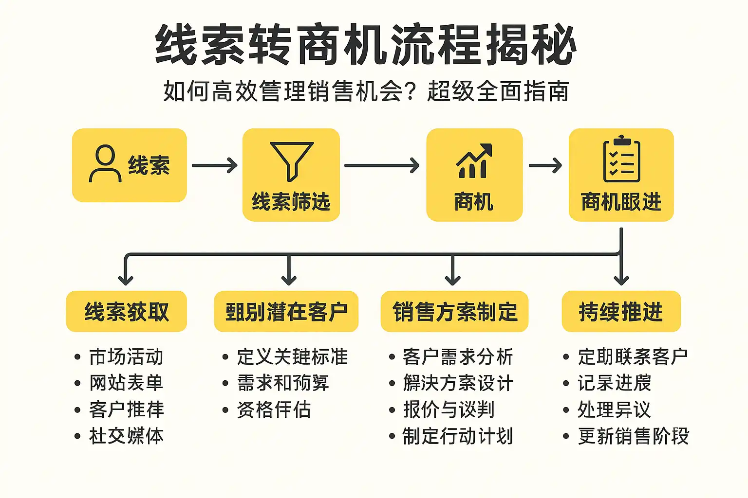 - 商机确认:确认客户有明确购买意向,转化为商机。