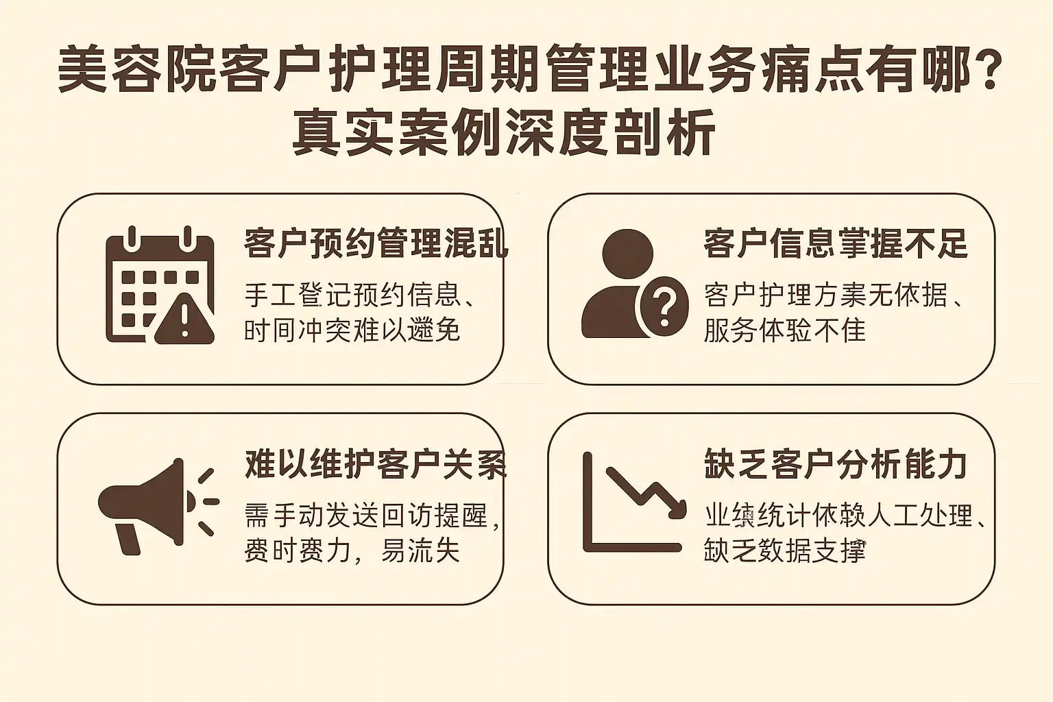 我在经营美容院时,发现客户护理周期管理总是出现各种问题,导致客户流失和满意度下降。到底美容院客户护理周期管理的主要痛点有哪些?为什么这些痛点会严重影响客户体验?
