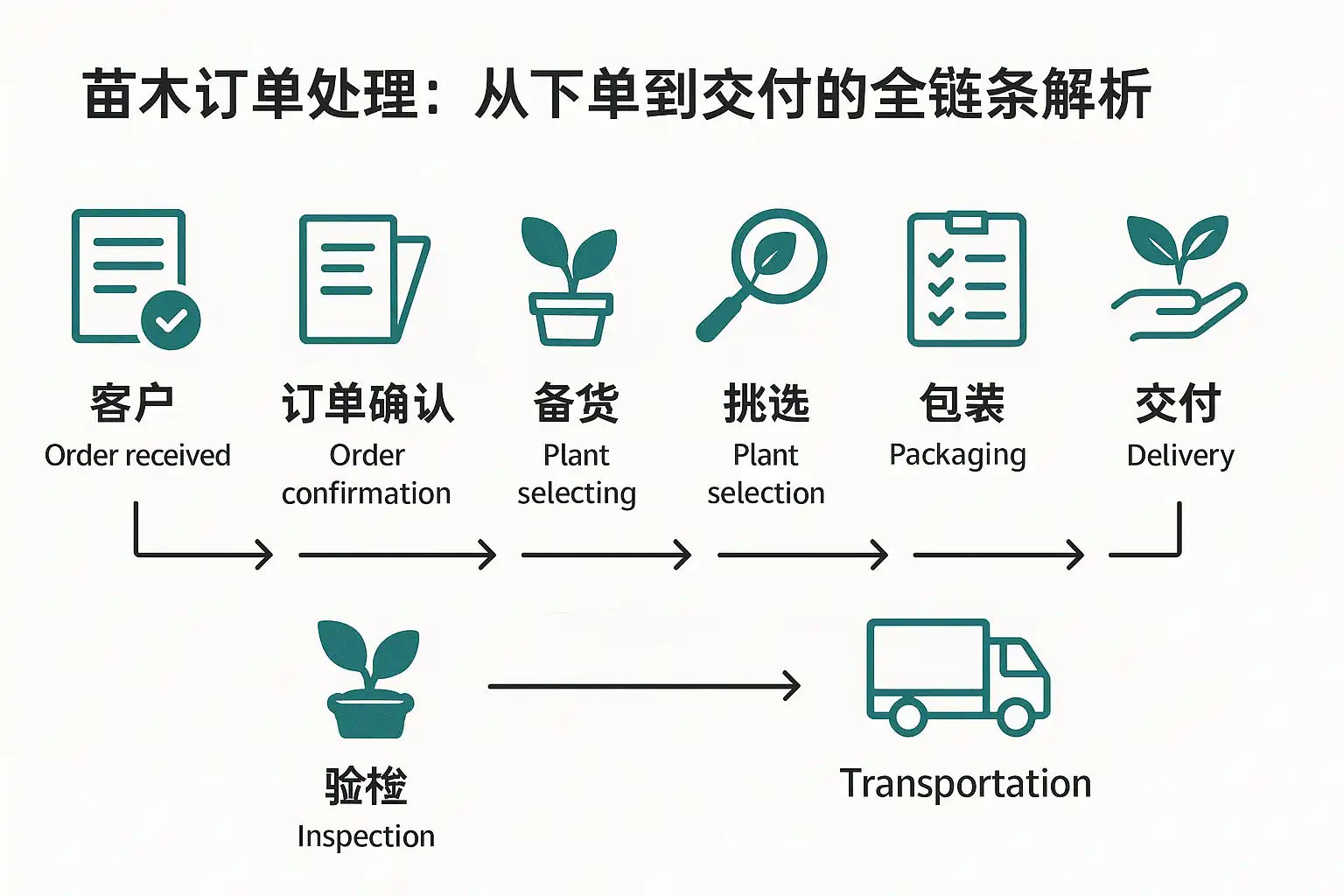 苗木订单的全链条包含:需求澄清与报价→合同与定金→备货与质检→起挖与装车→运输与在途养护→到货验收与交付→对账结算→售后与复购。关键角色与职责如下: