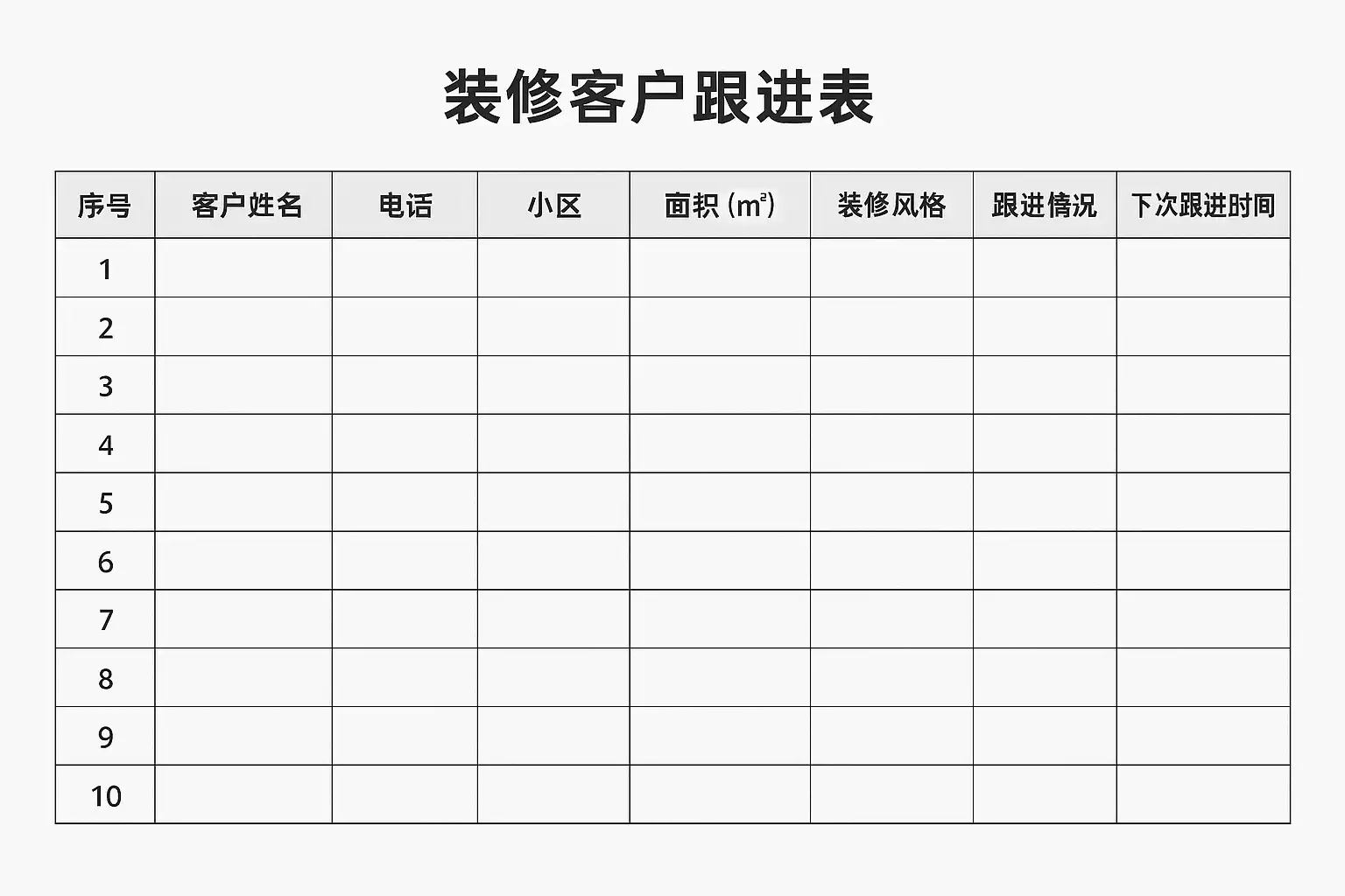 - 分析客户需求,精准推送装修方案。案例数据显示,使用结构化跟进表的装修公司客户转化率平均提升15%。
