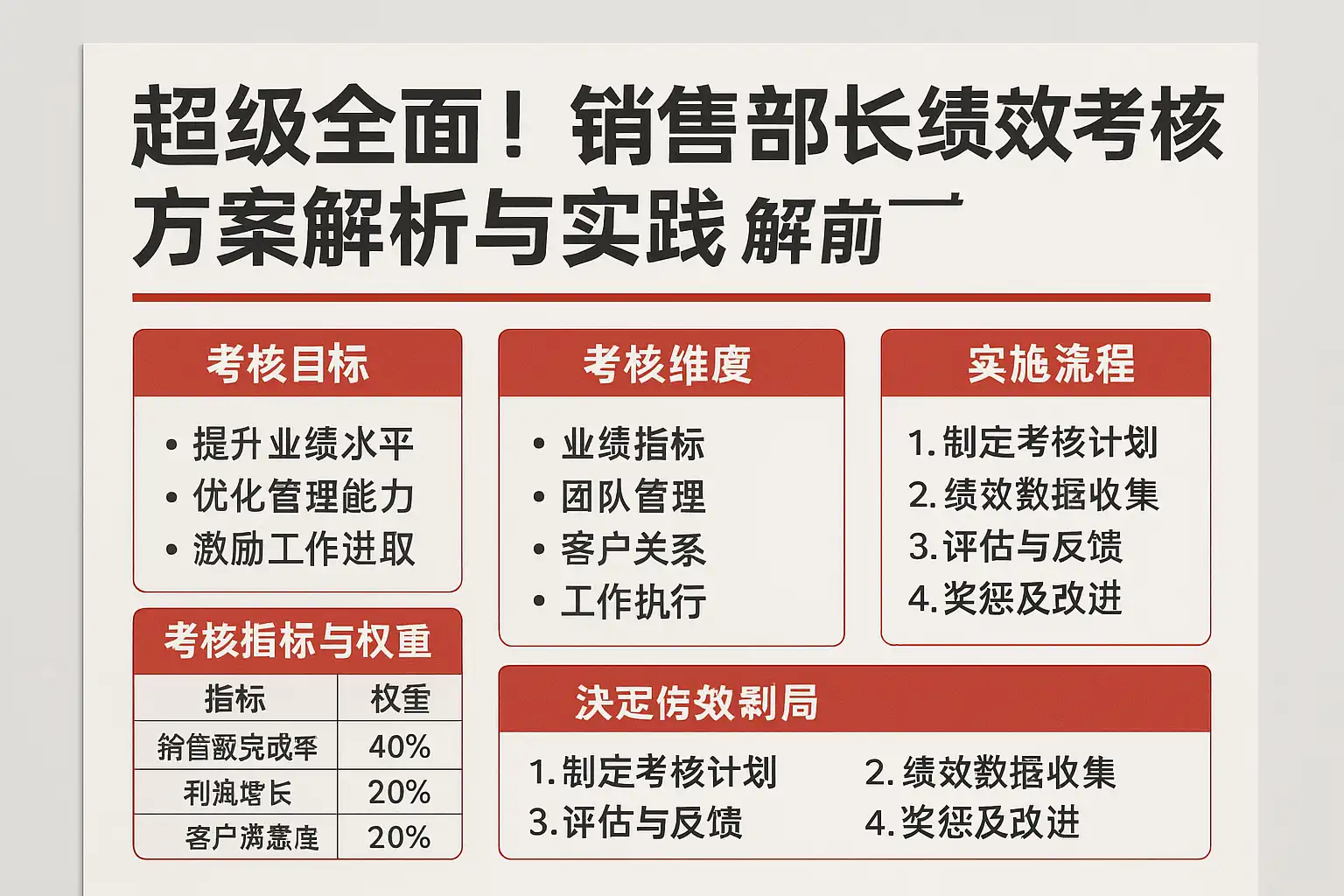 销售部长的本质职责是“达成业务目标+打造可复制的增长引擎”。据此,考核必须从“单点业绩”升级为“结果达成、过程质量、团队能力、合规风控”的组合拳。
