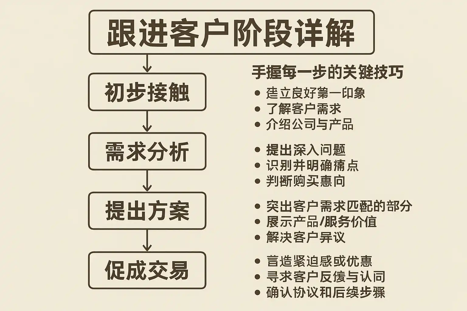作为销售人员,我经常困惑跟进客户的具体阶段有哪些?每个阶段应该重点关注什么,才能有效提升成交率?我想知道如何系统化地把握跟进流程。