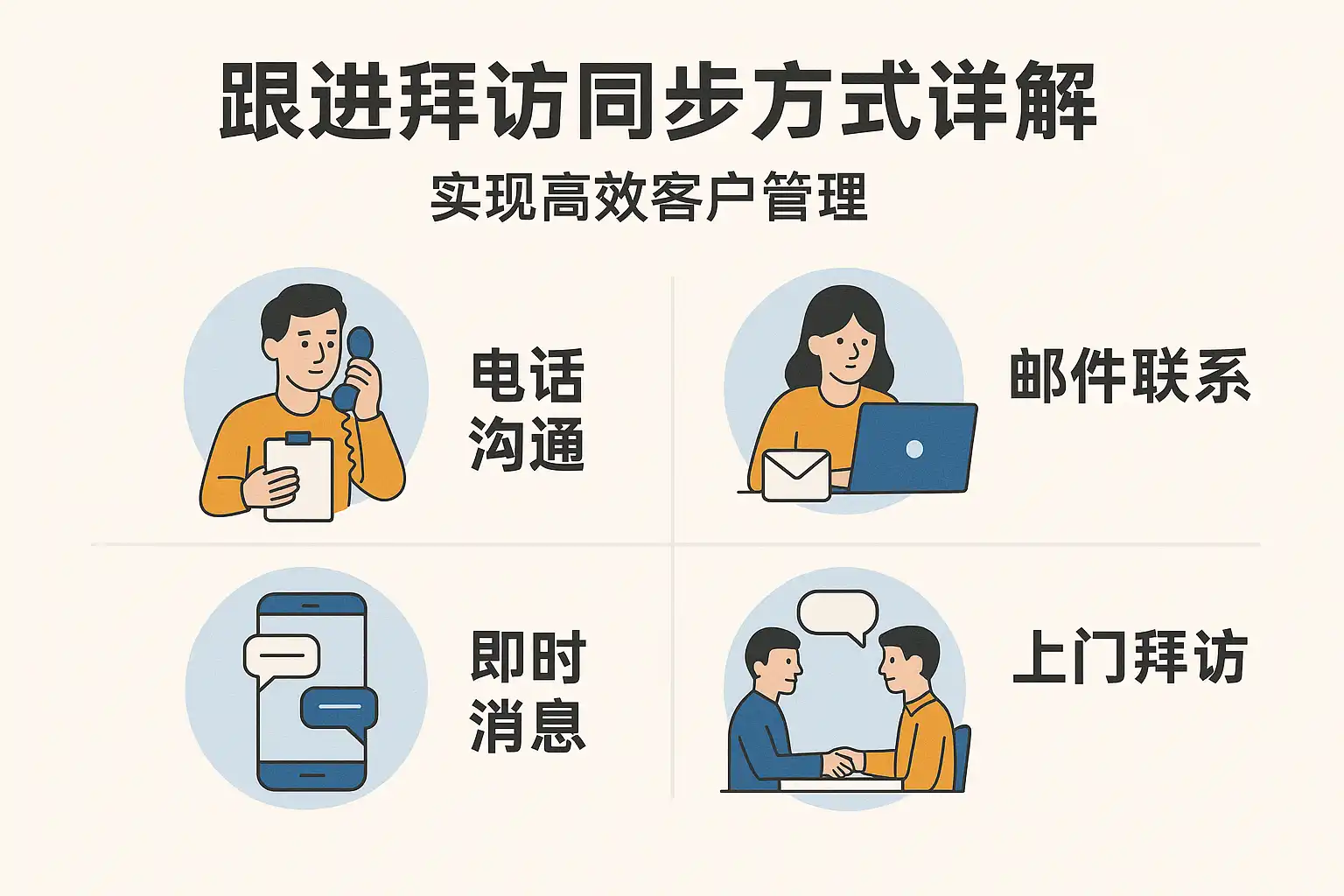 有哪些常见的跟进拜访同步方式?它们各自的优缺点是什么?