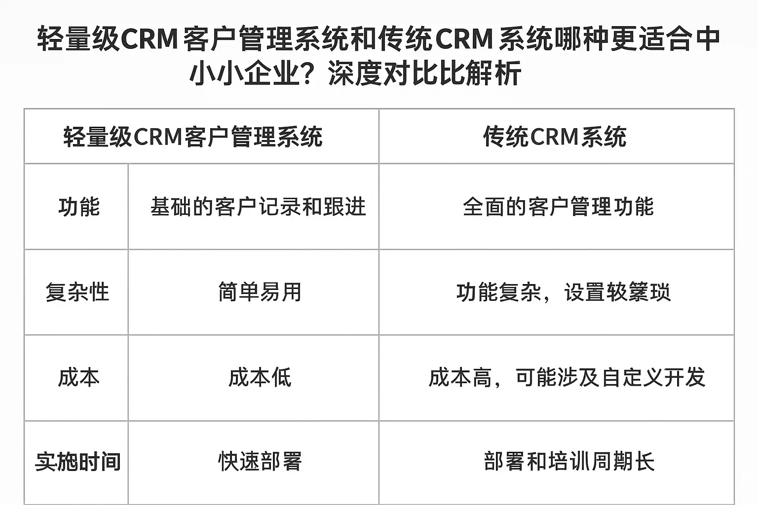 - 结论:对绝大多数中小企业而言,轻量级CRM是更优先的第一步;在业务规模上升、流程稳定后再评估是否升级为更重型系统。