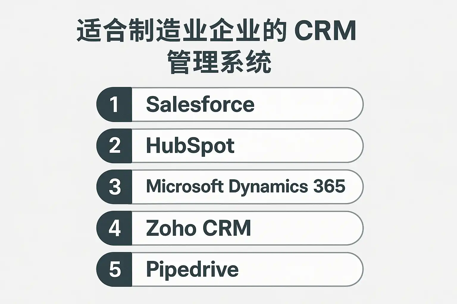 - 制造业最佳CRM需同时满足三类能力:业务闭环、系统集成、灵活定制。
