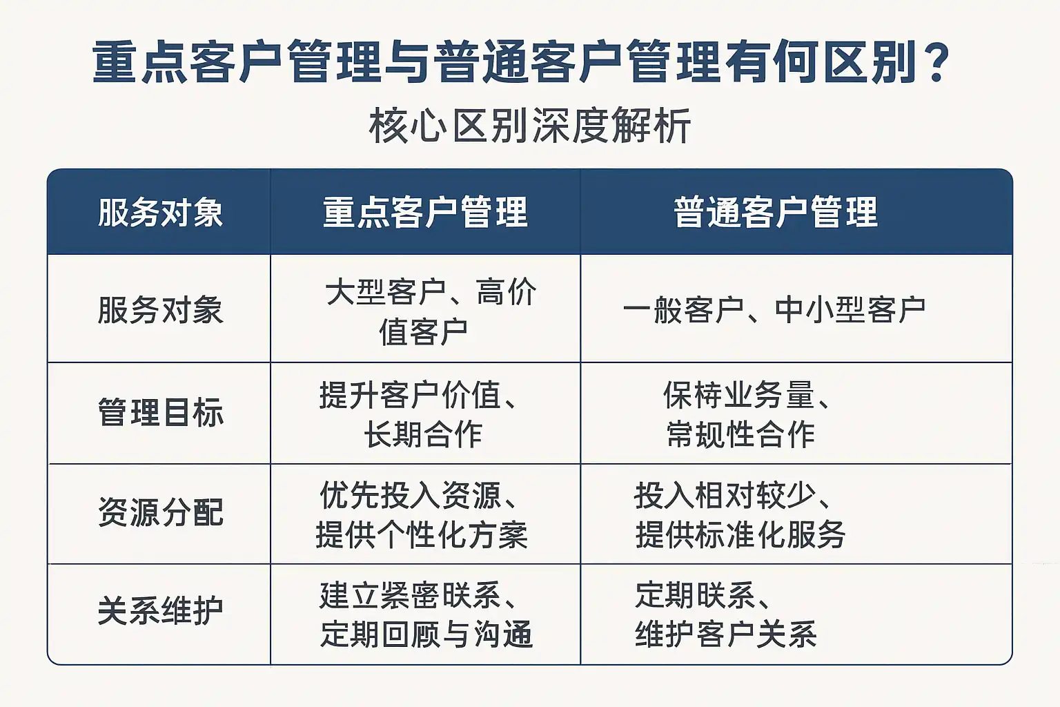 我在做客户管理时,经常听说重点客户管理和普通客户管理的区别,但具体核心区别到底是什么呢?想了解两者在策略和资源分配上的不同点。