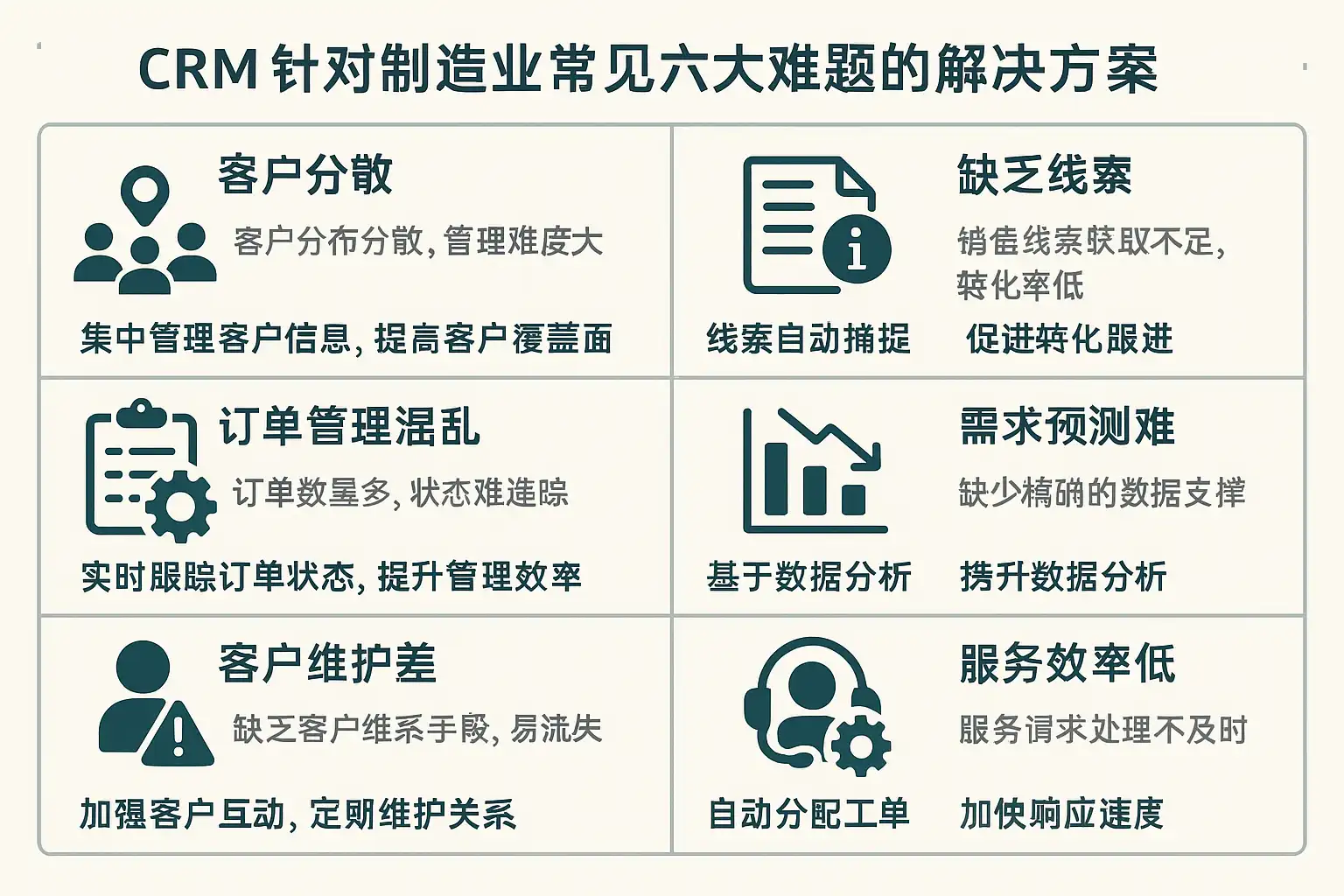 为便于落地,先将制造业CRM的六大常见难题与可操作的破解路径进行对应。
