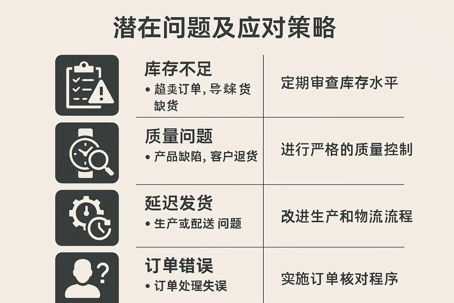 | 品质异常(外观/机芯) | 供应商质量波动、抽检不足 | 返修退货、售后成本上升 | 高 |