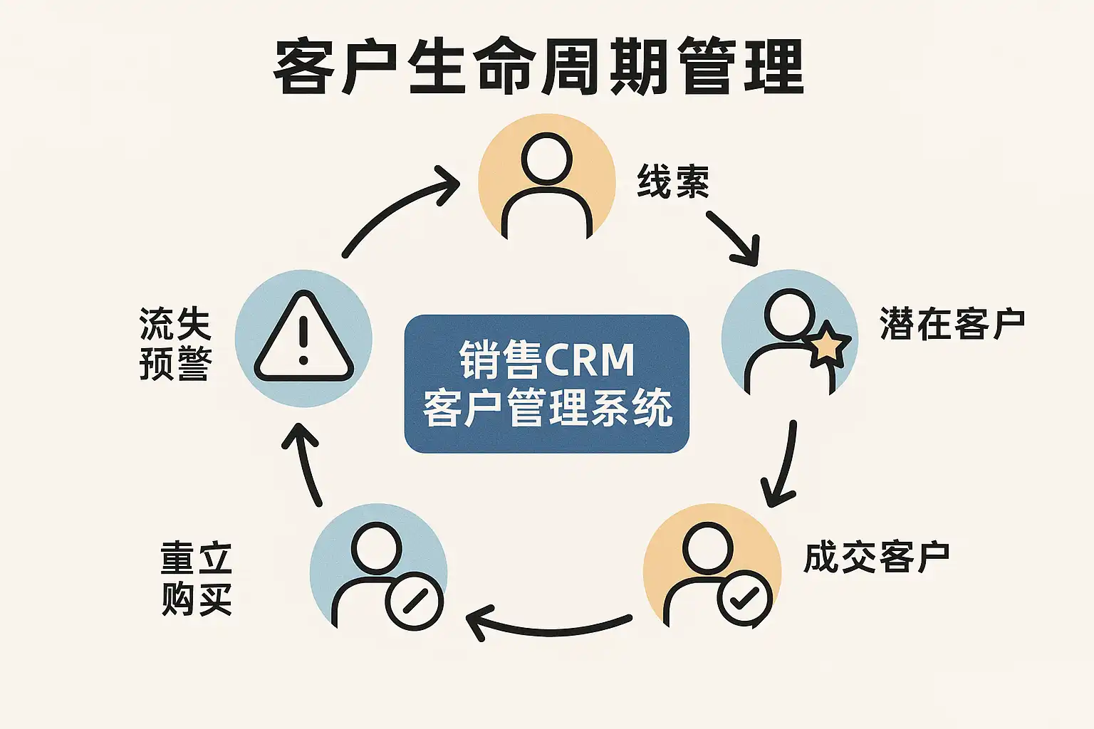 - 阶段划分:线索(潜在)→ 首购(新客)→ 入门(Onboarding)→ 成长(活跃)→ 忠诚(复购/会员/推荐)→ 流失预警 → 挽回/重启。