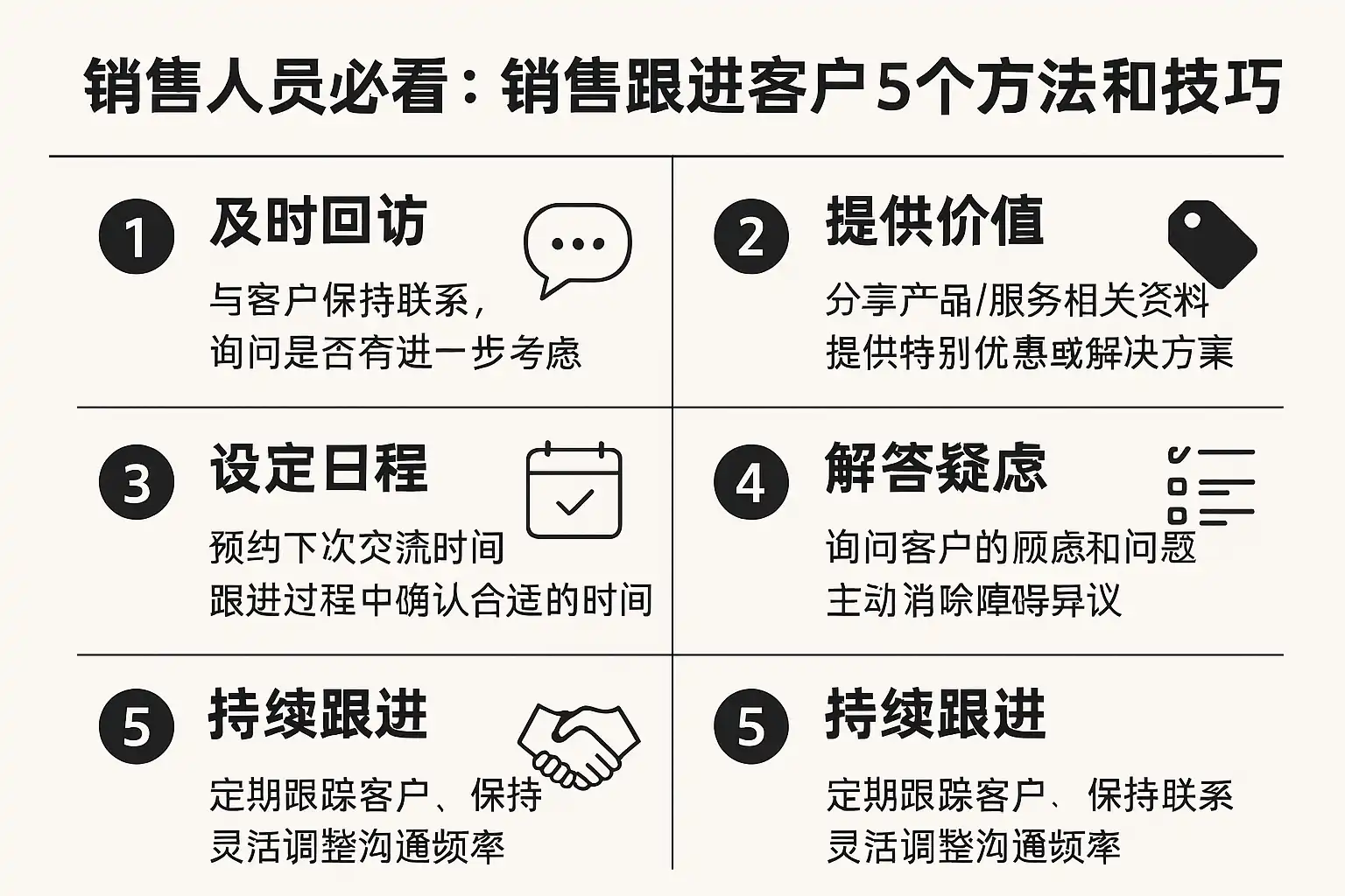 | 节奏化跟进 | 沉默与拖延 | 多渠道组合、定期触达 | 跟进节奏表、自动提醒 |