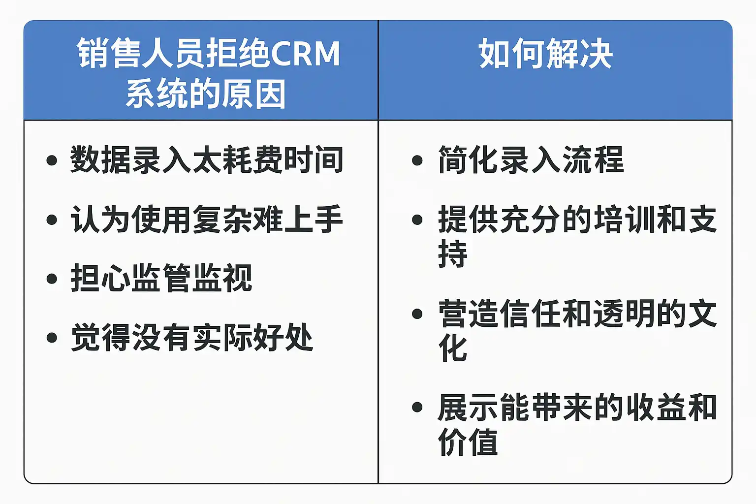 - 激励错位:KPI只看结果不看过程,使用CRM既耗时又不加分。