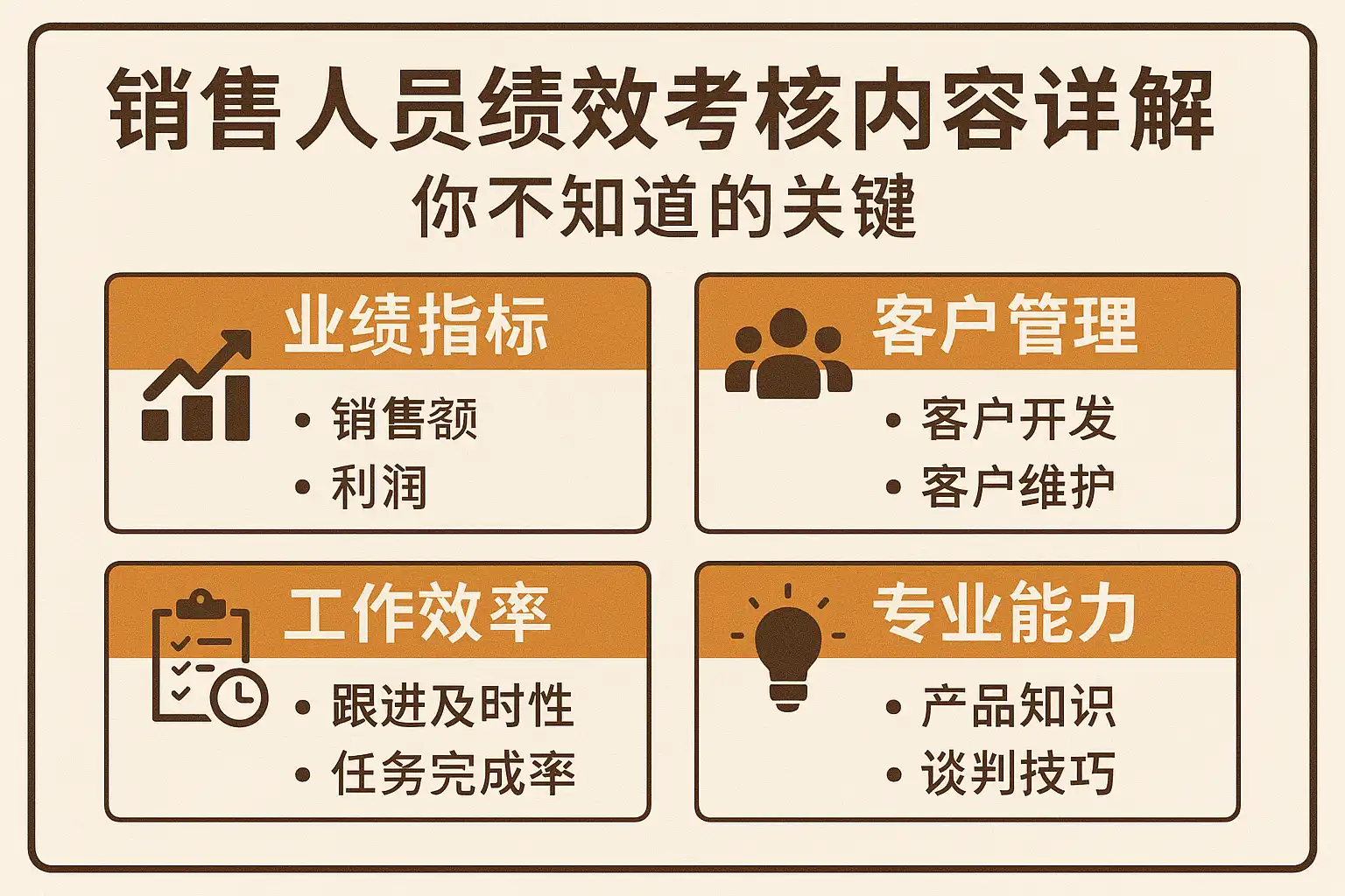 - 绩效考核需“结果+过程+客户价值+效率”四维组合,权重按角色与周期分层。