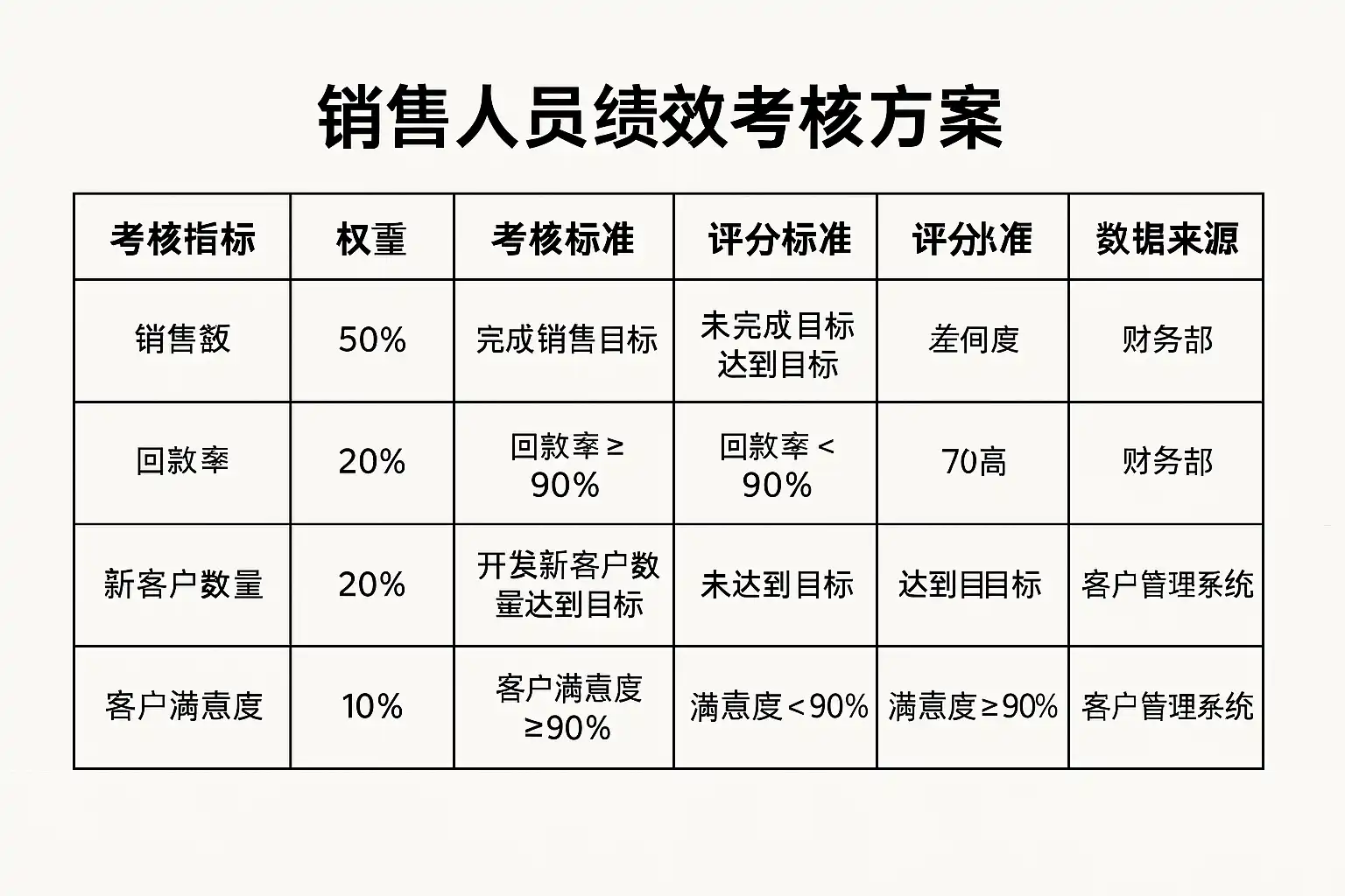 - 目标达成型:以销售额、客户数等关键指标为核心,适合量化考核;