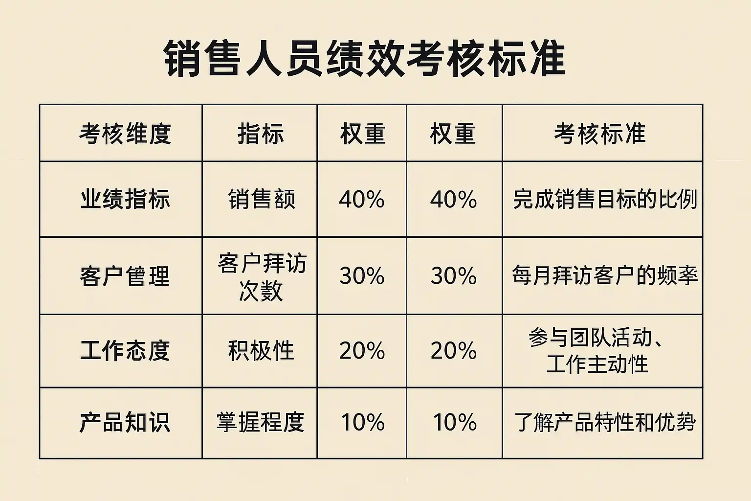 | 3. 确定权重分配 | 例如:销售额占50%,客户满意度占20%,能力提升占30% |