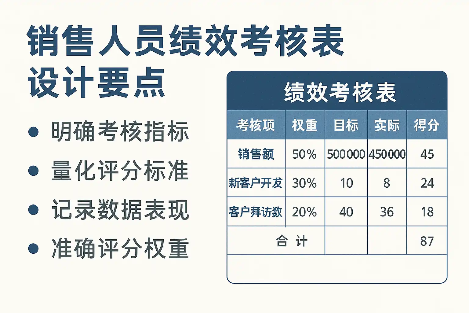 - 设定合理权重:根据公司战略目标,为各指标分配权重,如销售额权重50%,客户维护率30%,成交率20%。