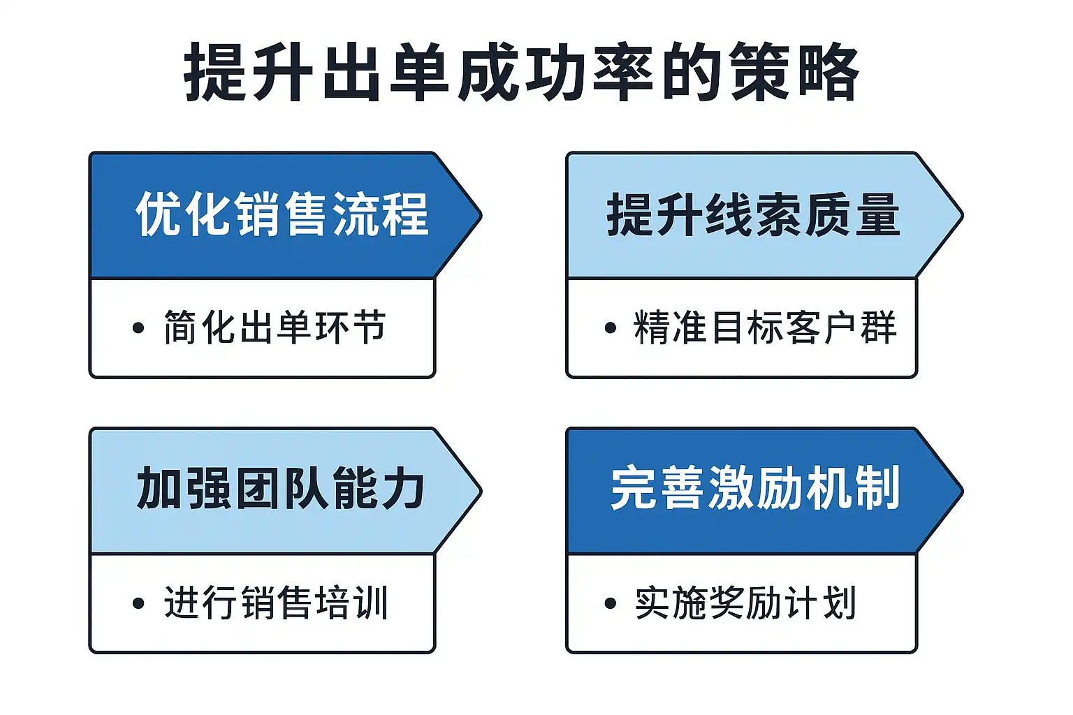 - 提升出单成功率的决定性因素是“线索质量×SLA响应×SOP可复制×报价短链路×数据闭环×工具自动化”。