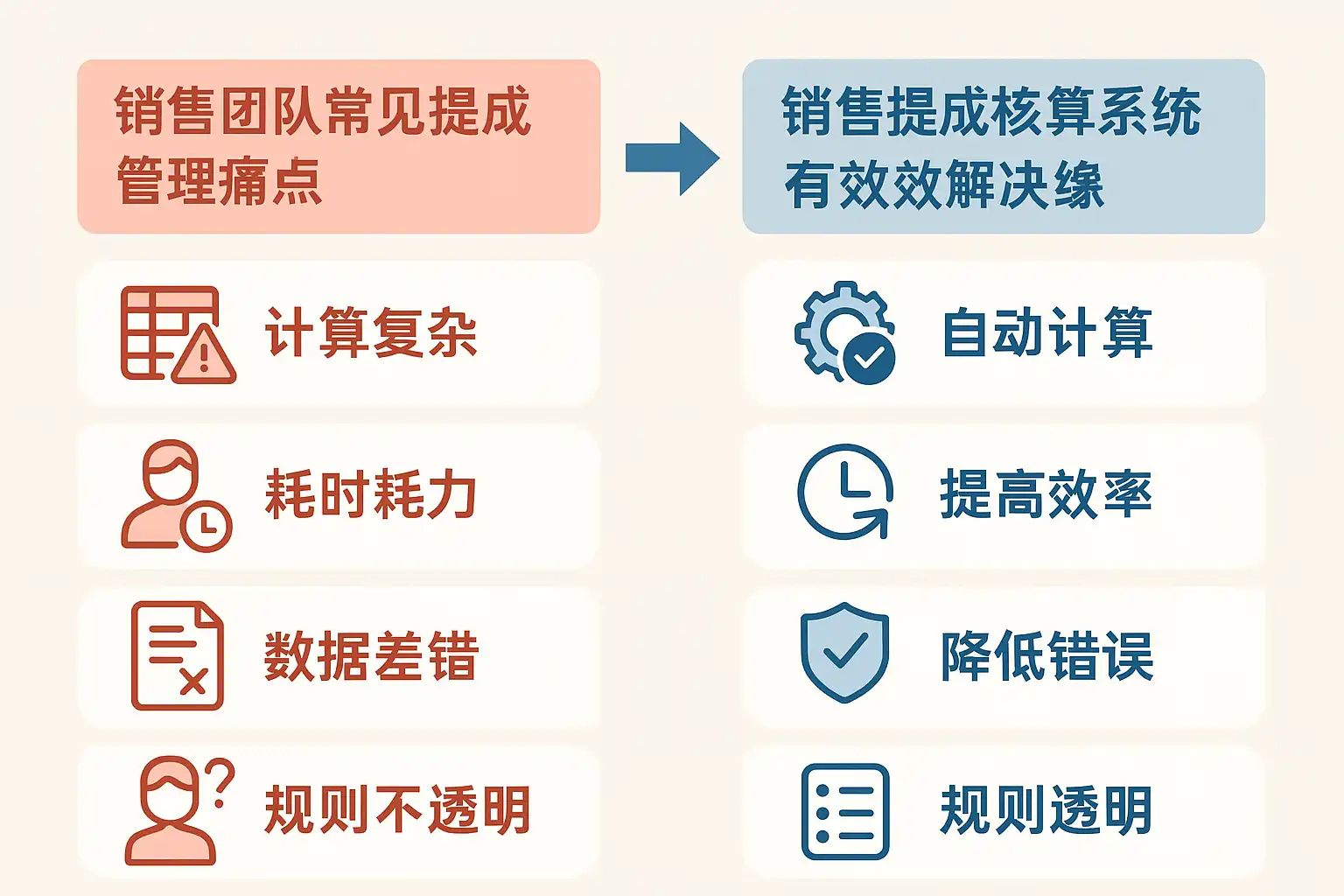 - 计算复杂:多维度提成规则导致手工计算容易出错。