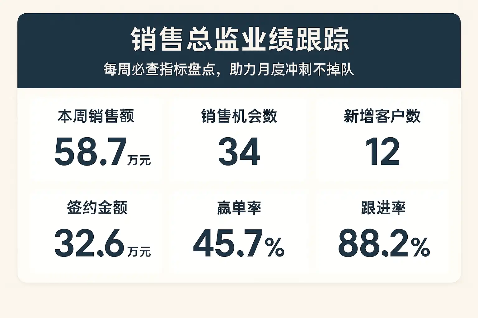 - 销售总监:选定年度/季度指标篮子,设阈值与节奏;统筹冲刺方案与资源