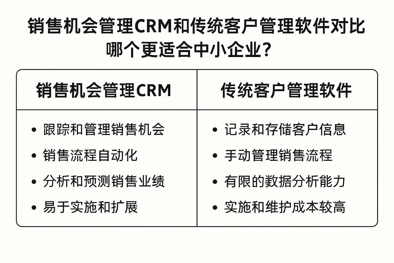 | 维度 | 传统客户管理软件(联系人/客户) | CRM销售机会管理 | 业务影响 |
