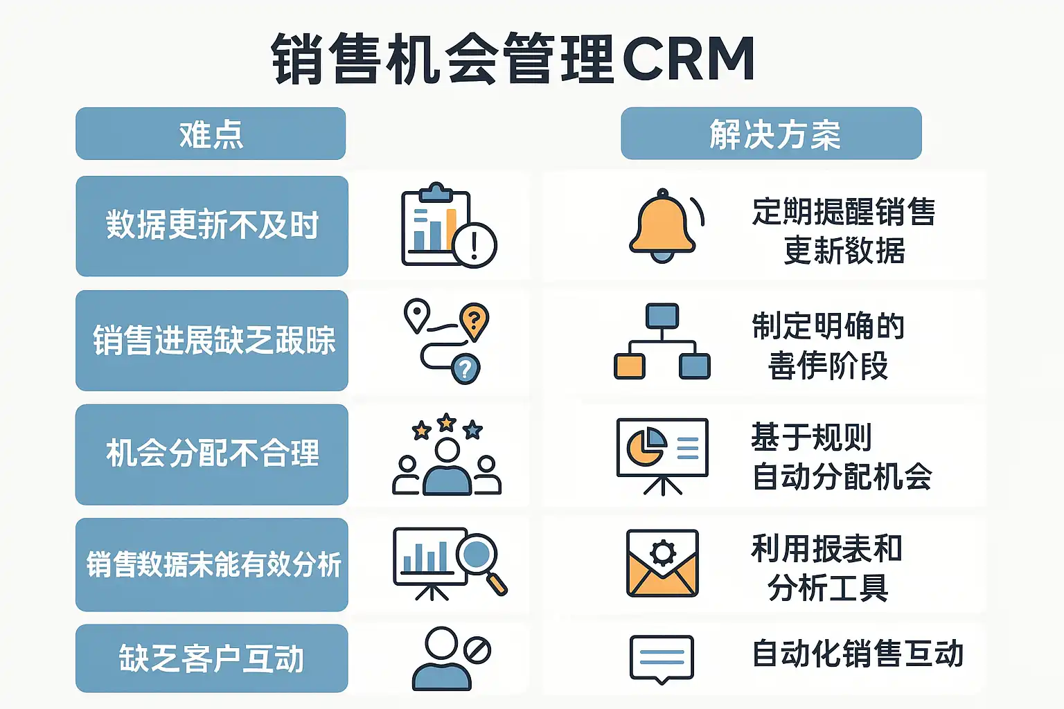 | 推进无节奏 | 机会停留超30天、跟进记录缺失 | 无SLA与推进模板 | 制定阶段SLA和行动清单,逾期自动提醒 | 自动化任务、逾期提醒、跟进模板 |