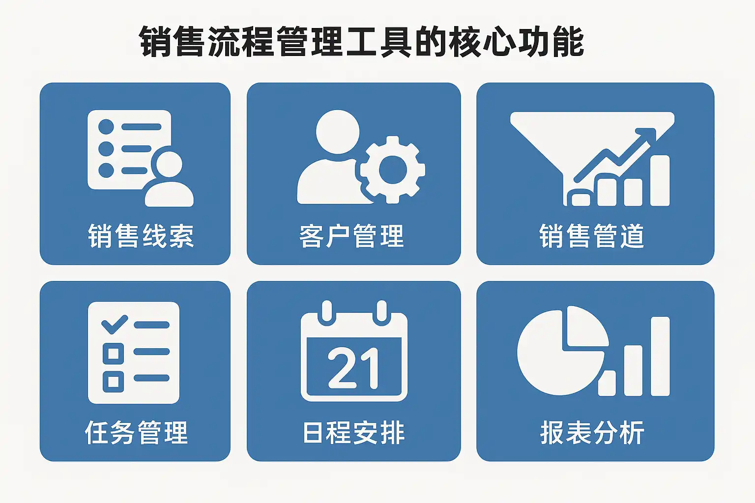 销售流程管理工具的不可或缺模块包括线索/客户、商机/报价、流程/审批、合同/订单/回款、数据分析与预测、权限与审计、自动化与集成、协作与移动化八大板块。