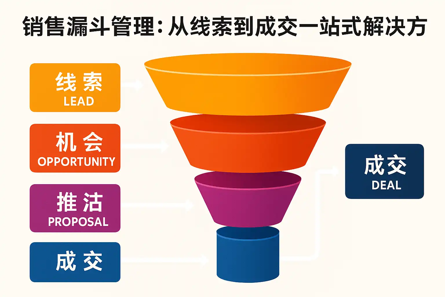 - 可执行:每个阶段绑定具体动作(触达、资格判断、跟进节奏)。