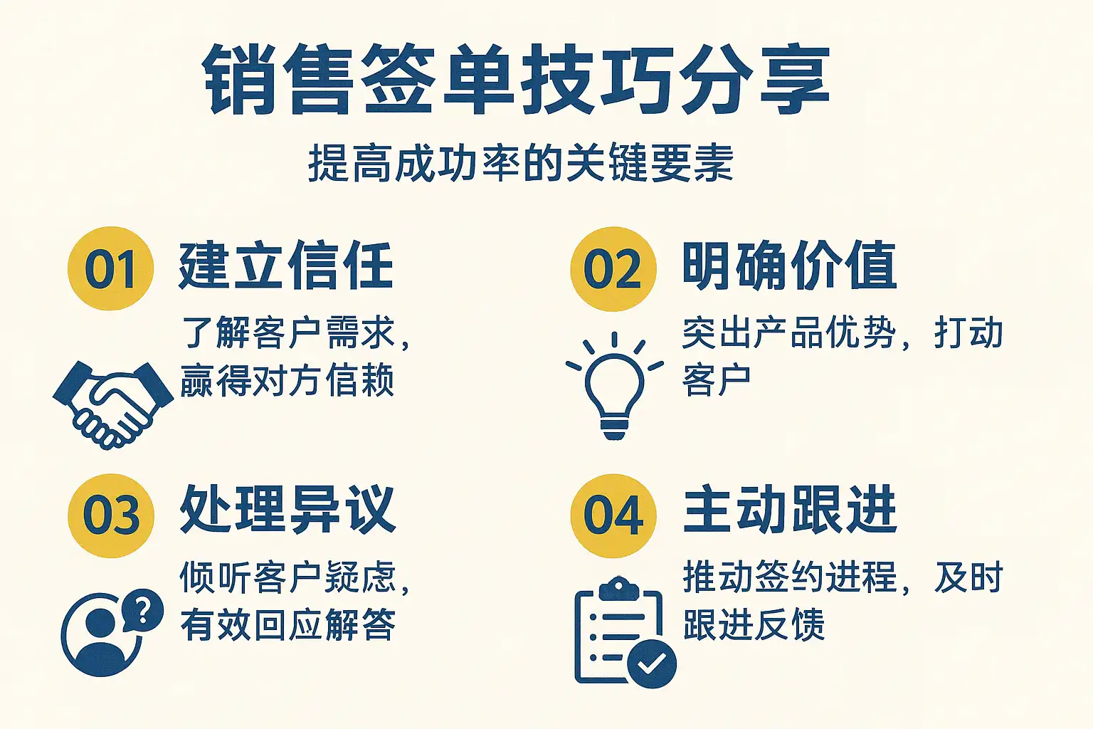 快速提升签单成功率的关键在于掌握有效的销售签单技巧,主要包括:
