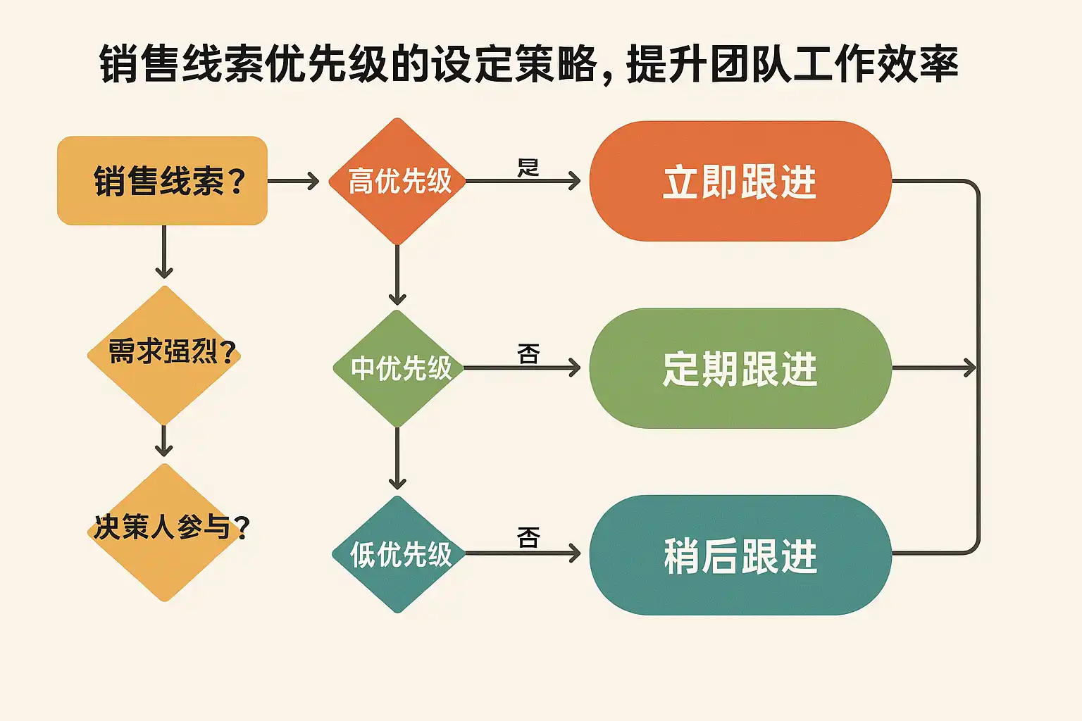 - 需求紧迫性:通过沟通判断客户采购时间窗口,紧迫度高的线索优先处理。