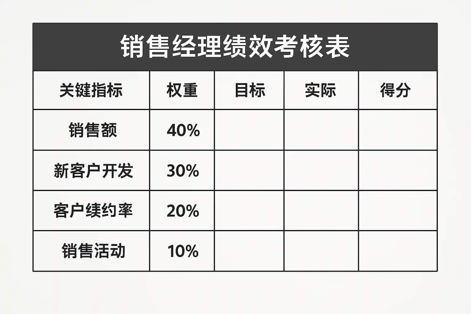 - 总分=Σ(指标分×权重),指标分可按达成比例或区间打分。