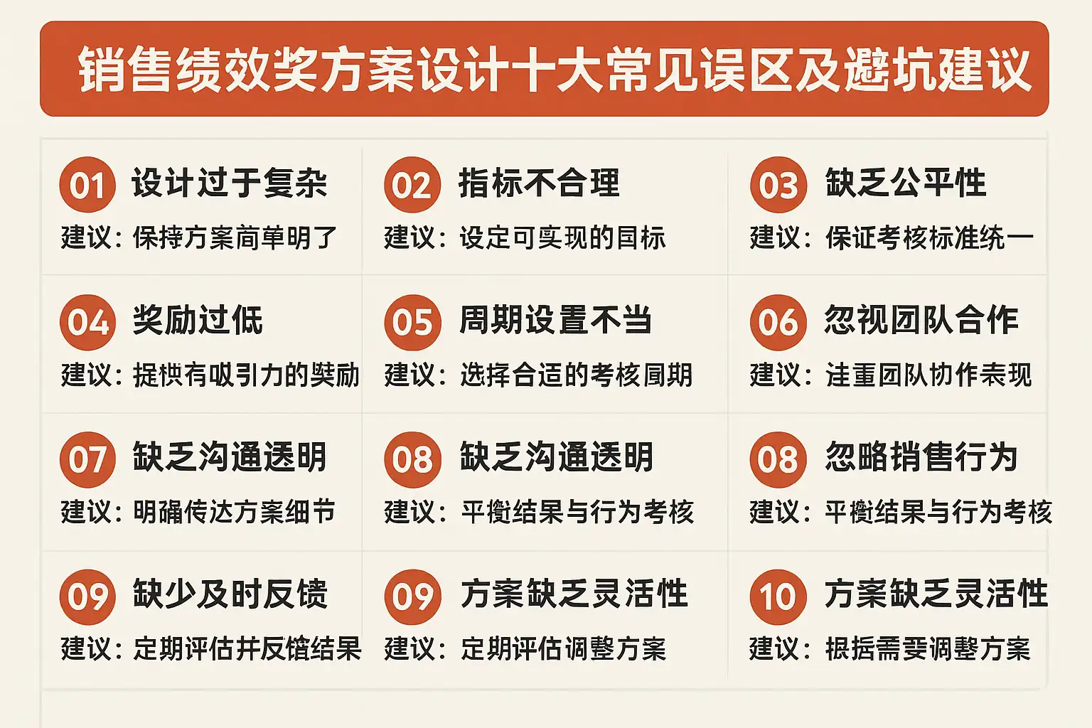 以下是设计销售绩效奖时最常见的误区、表现、后果与修正方向,建议作为上会评审的快检清单。