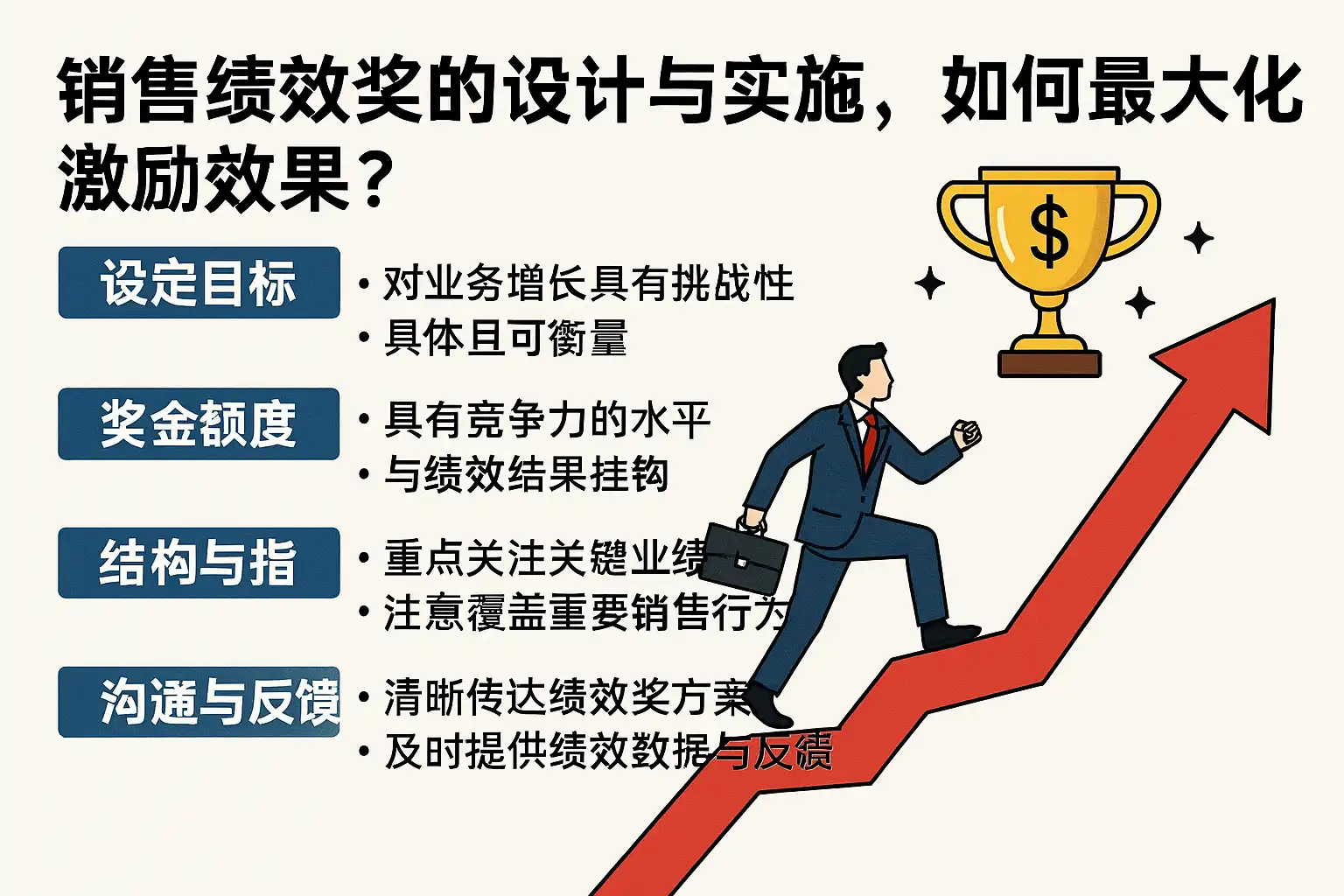 - 合理的奖励结构——结合固定奖励和浮动奖金,增强激励弹性。