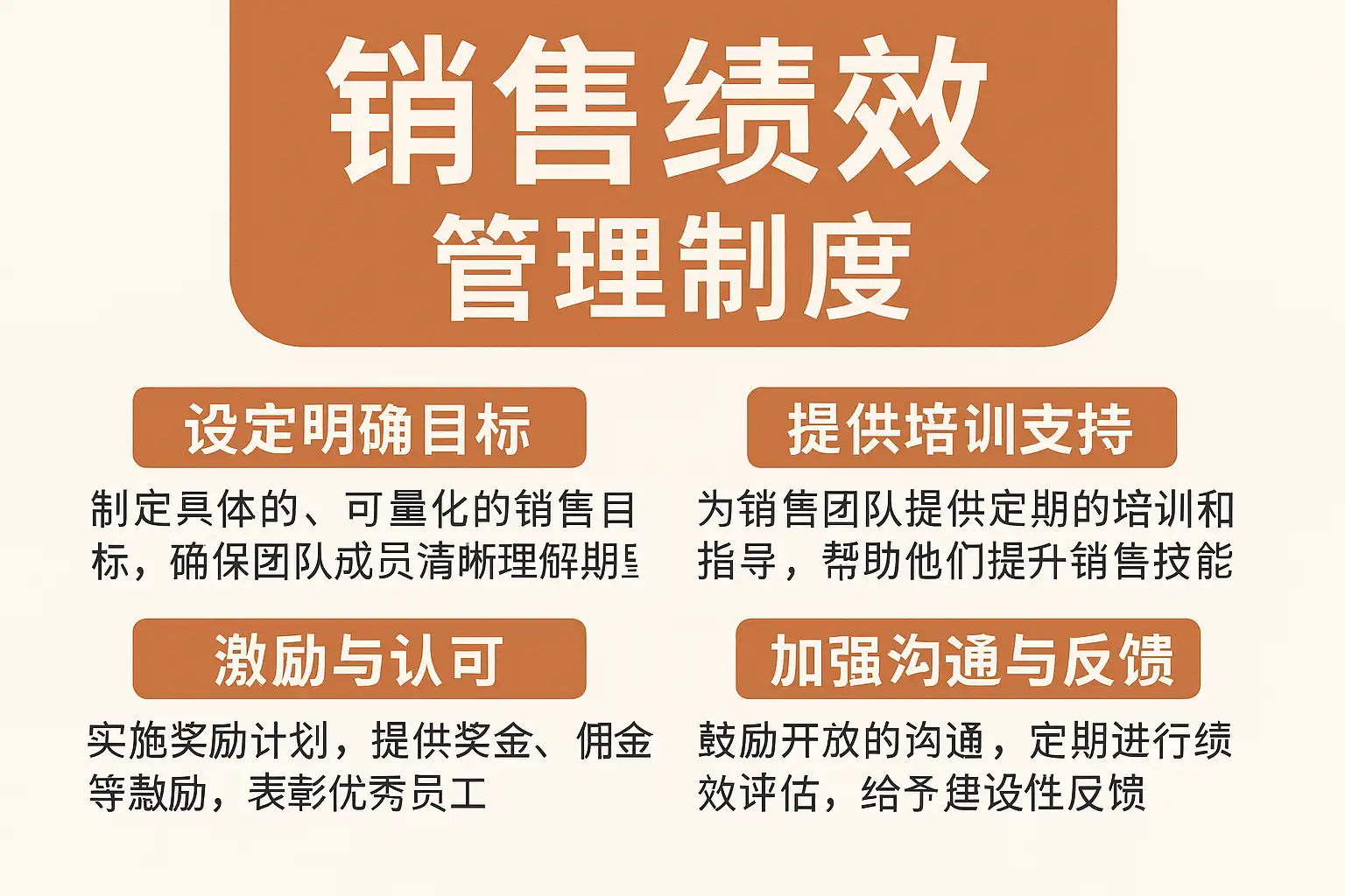 - 多元化激励:结合物质奖励(奖金、提成)与精神激励(表彰、成长机会);