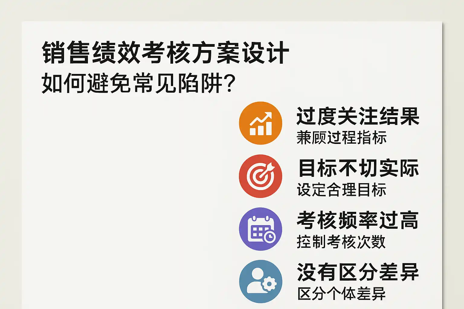- 差异化:不同岗位与销售周期指标不同,避免“一刀切”。