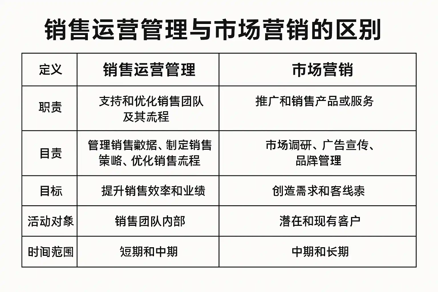 | 维度 | 市场营销(Marketing) | 销售运营管理(Sales Operations) |