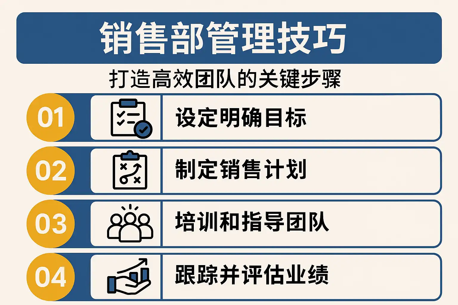 高效销售团队的打造并非“单点开花”,而是“目标-组织-流程-数据-激励-文化-工具”的系统工程。建议按以下关键路径推进: