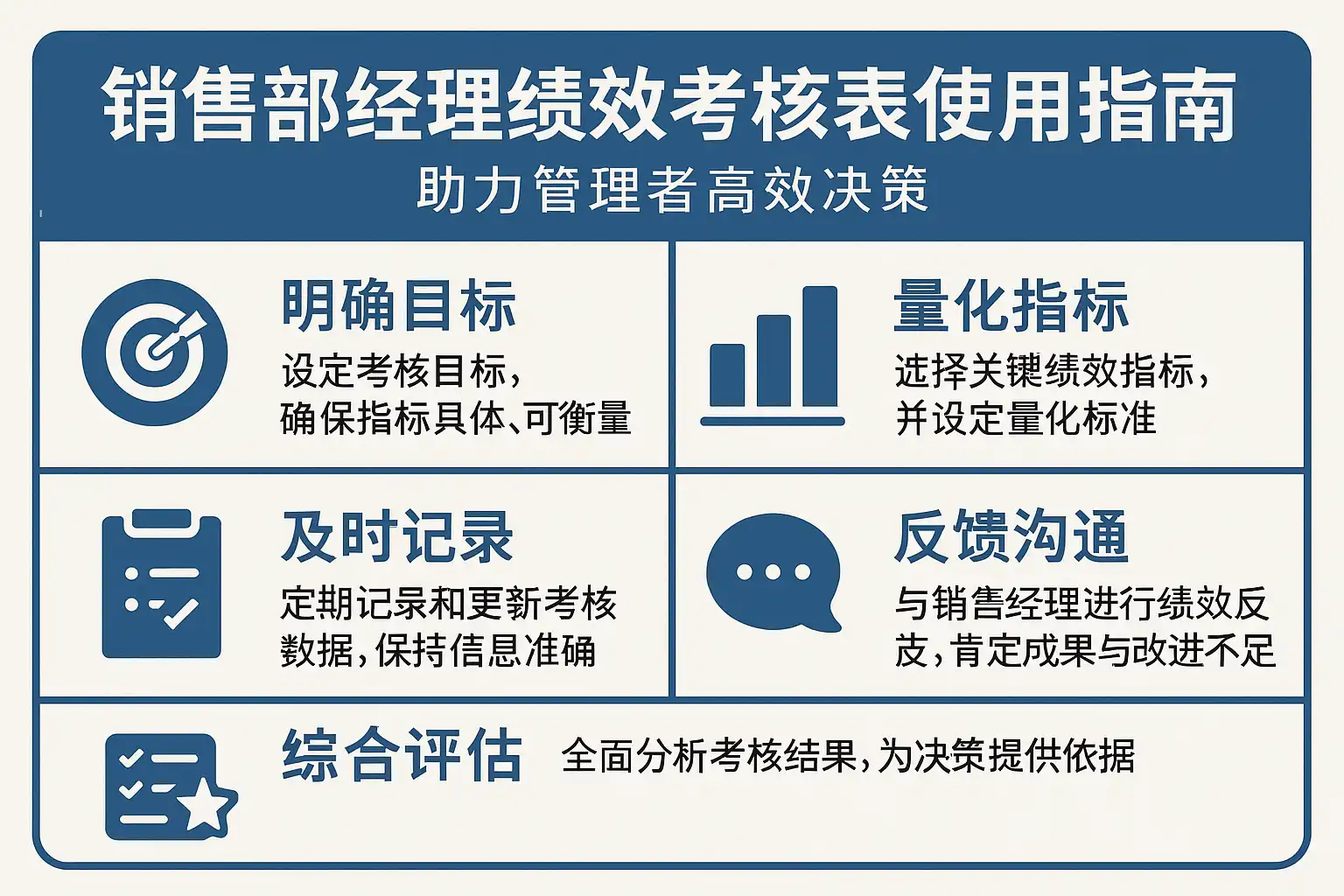 - 定位:销售部经理绩效考核表,是连接目标-执行-复盘-激励的统一载体,要为如下决策提供“即取即用”的证据: