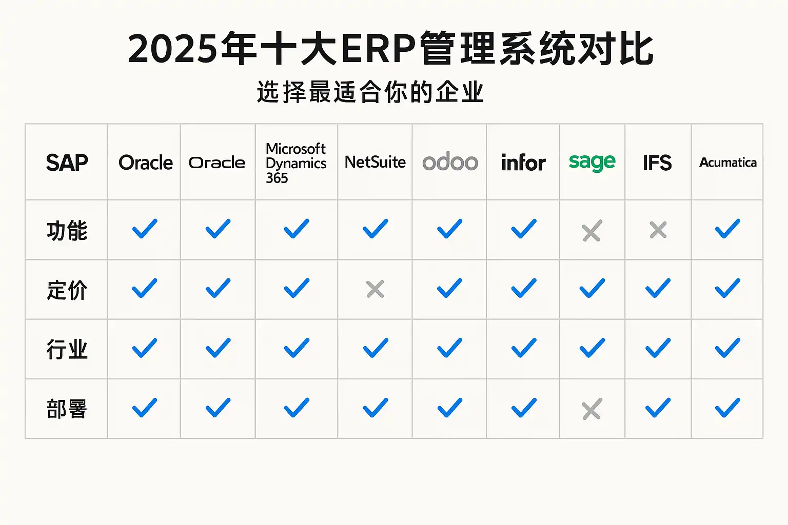 | 5 | Infor CloudSuite | 大型 | 汽车、食品饮料、时尚 | SaaS | 行业模板成熟 | 150万–800万 | 行业套件深度与模板化 |