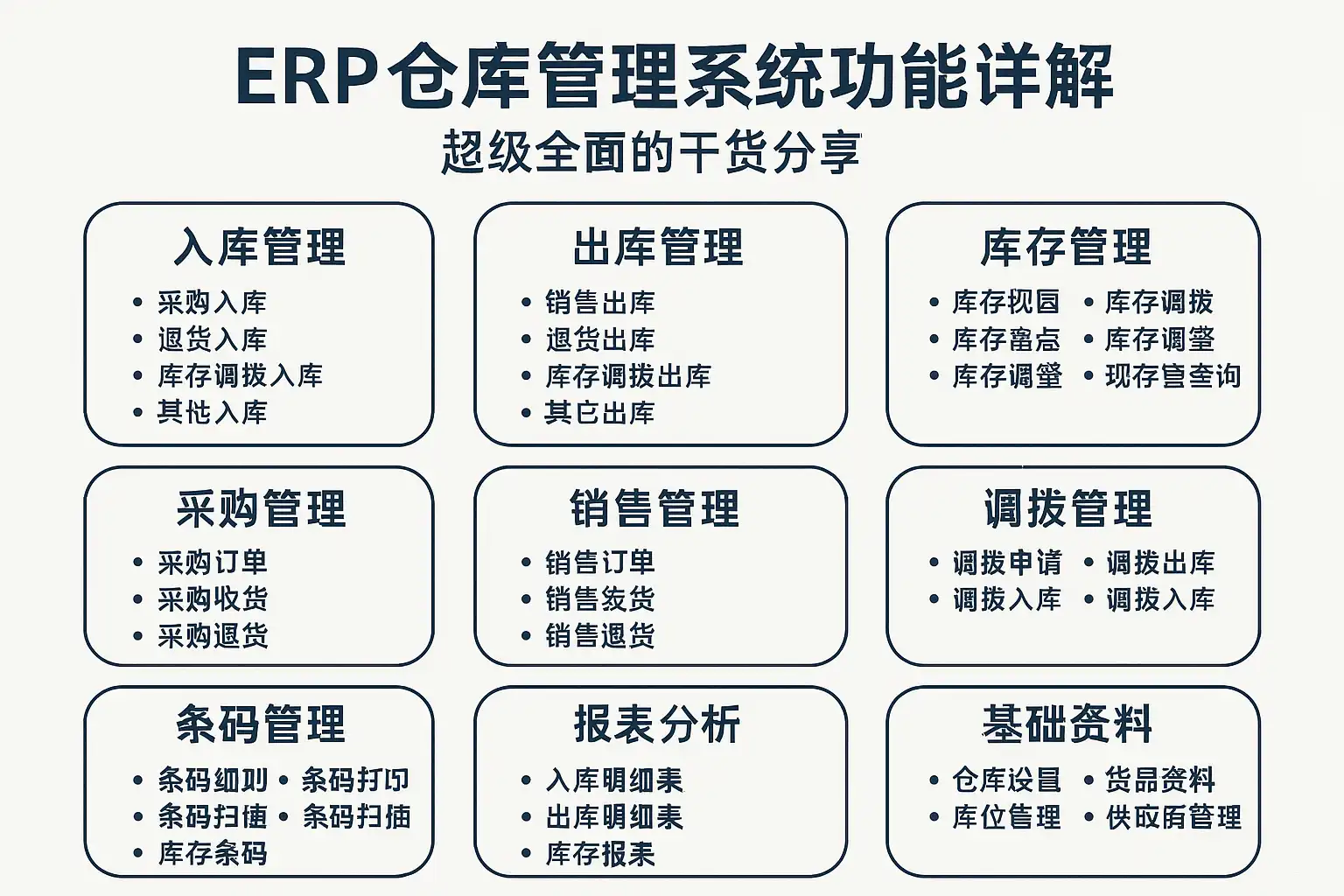 作为一名仓库管理员,我经常听说ERP仓库管理系统能大幅提升工作效率,但具体它包含哪些核心功能呢?我想了解这些功能如何帮助我优化库存管理和发货流程。