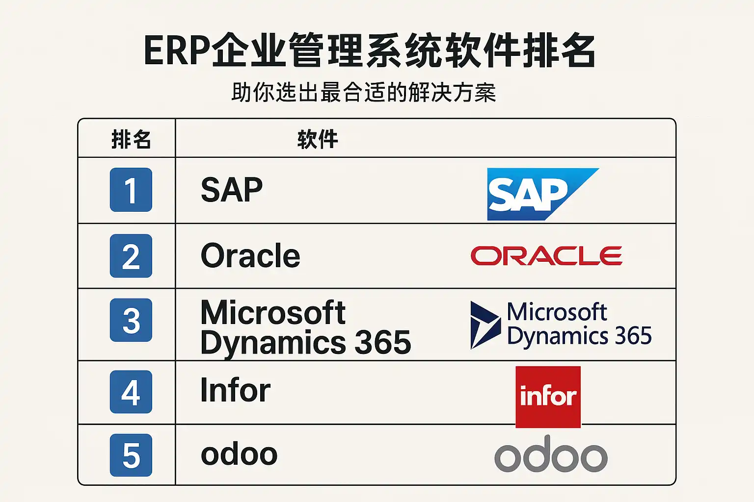 - 集团管控/跨国业务:SAP S/4HANA、Microsoft Dynamics 365、Oracle NetSuite。