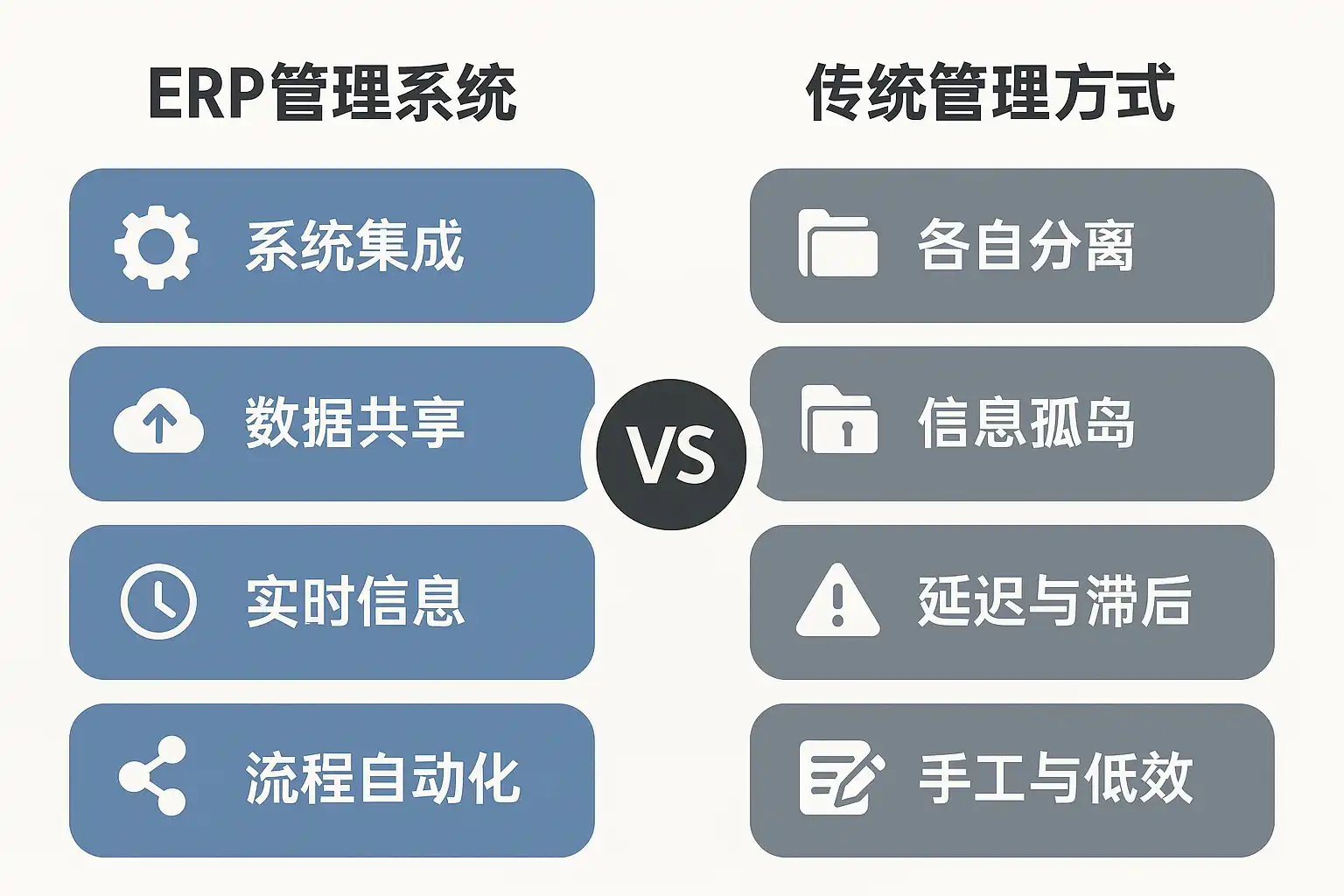 | 维度 | 传统管理(纸本/Excel/分散系统) | ERP管理系统 |