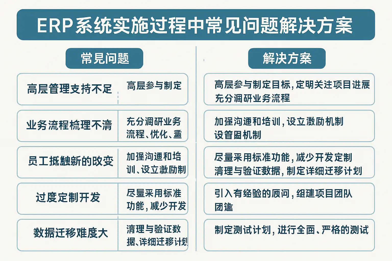 我在了解ERP系统实施时,发现很多企业都会遇到各种问题,但具体都有哪些常见的困难呢?实施过程中哪些问题最容易被忽视?