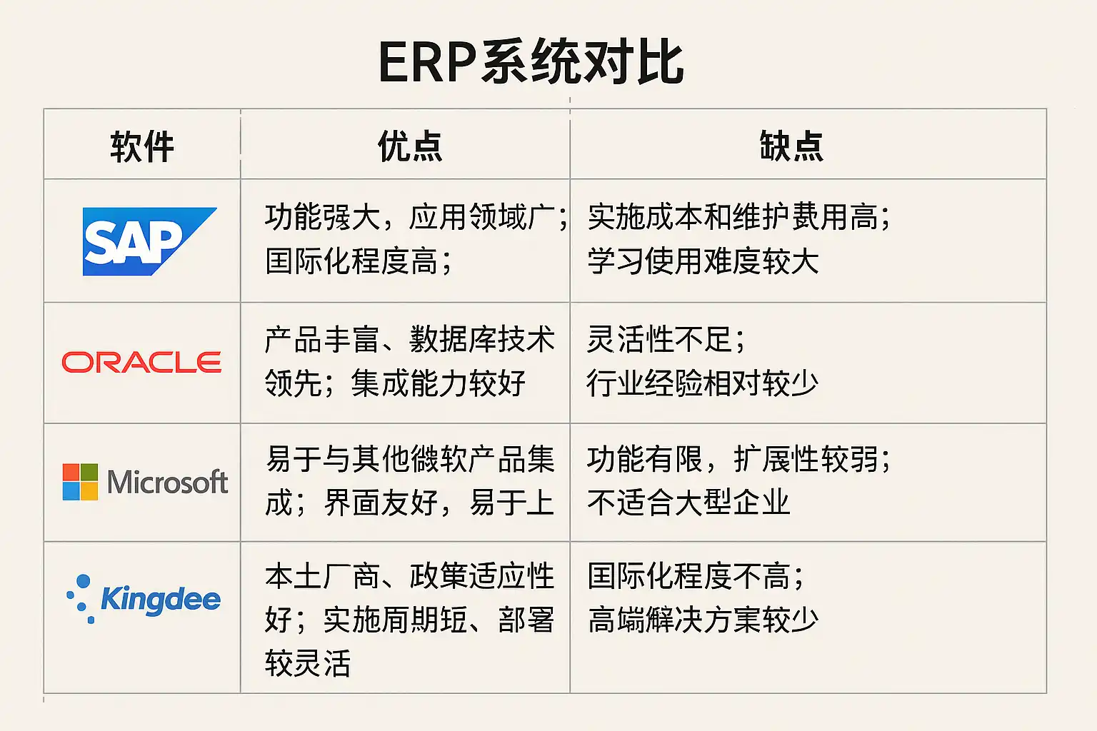 | SAP | 大型企业 | 功能全面,全球化支持 | 宝钢、华为等大型企业 |