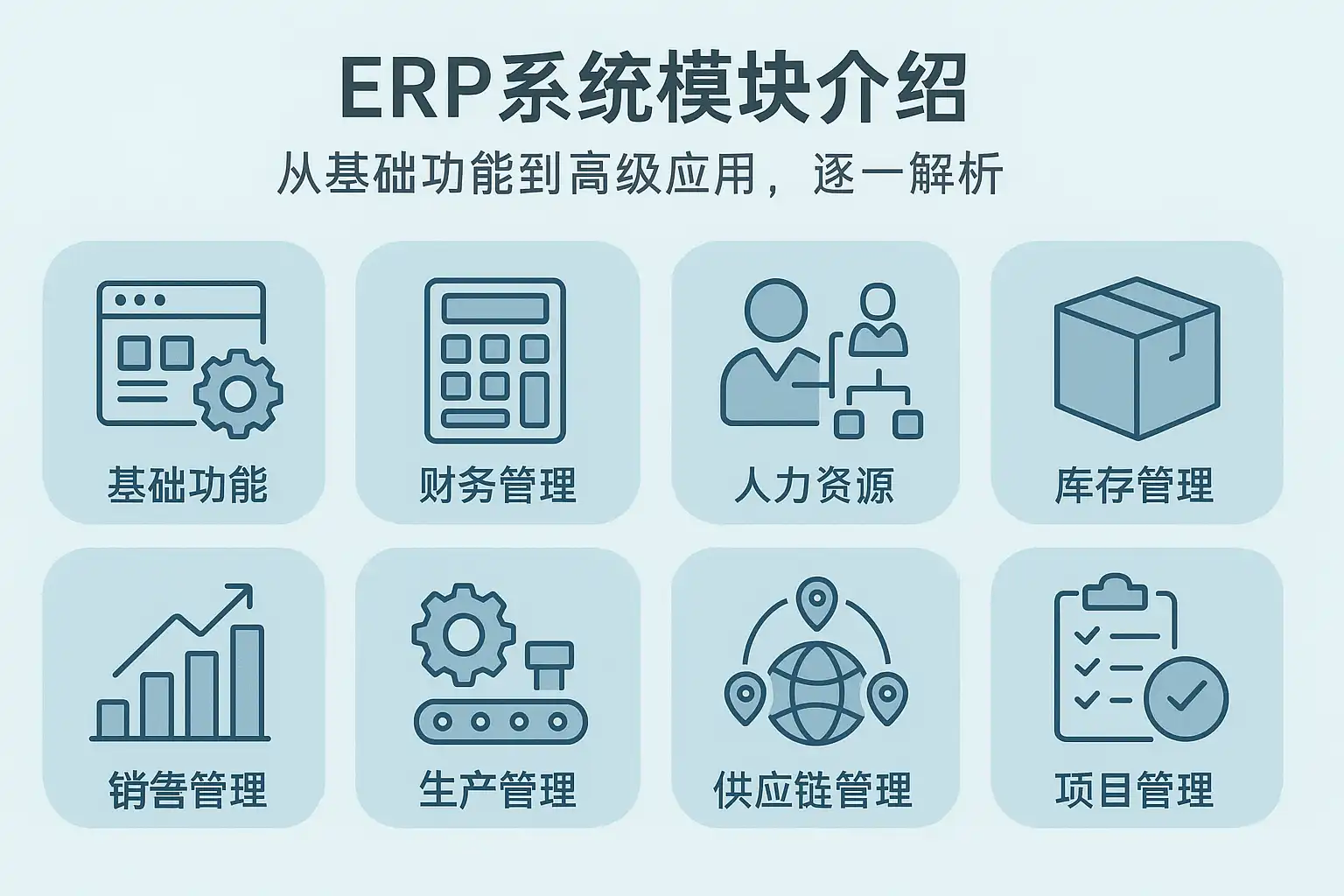 我刚开始了解ERP系统,但听说ERP系统模块很多,基础功能和高级应用模块都包括哪些内容?能不能详细说说各模块的作用,帮我理清楚思路?