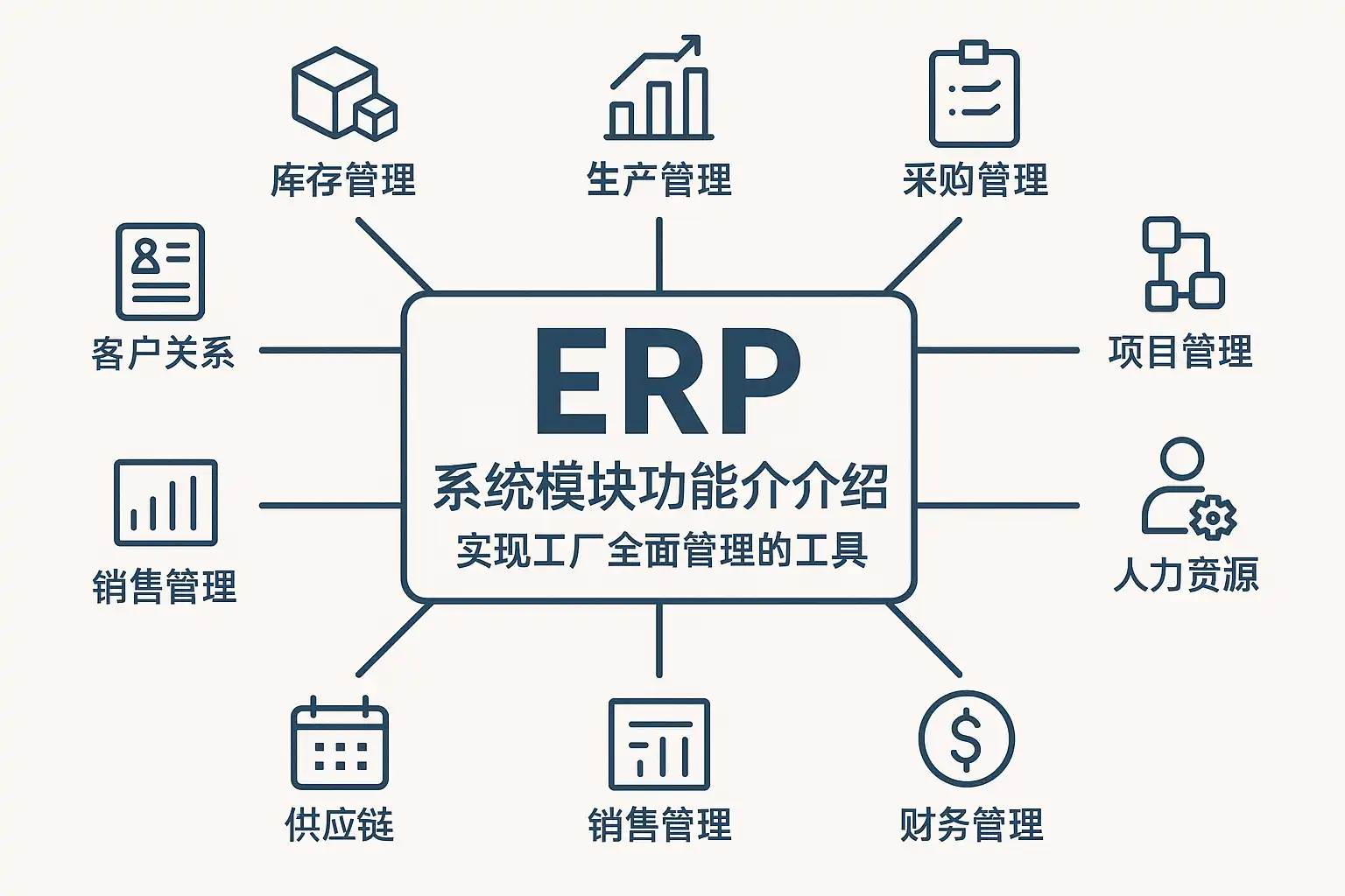 - 定义:ERP是围绕“订单—计划—采购—生产—库存—交付—结算”的企业经营中枢,保障数据一致与流程标准化。