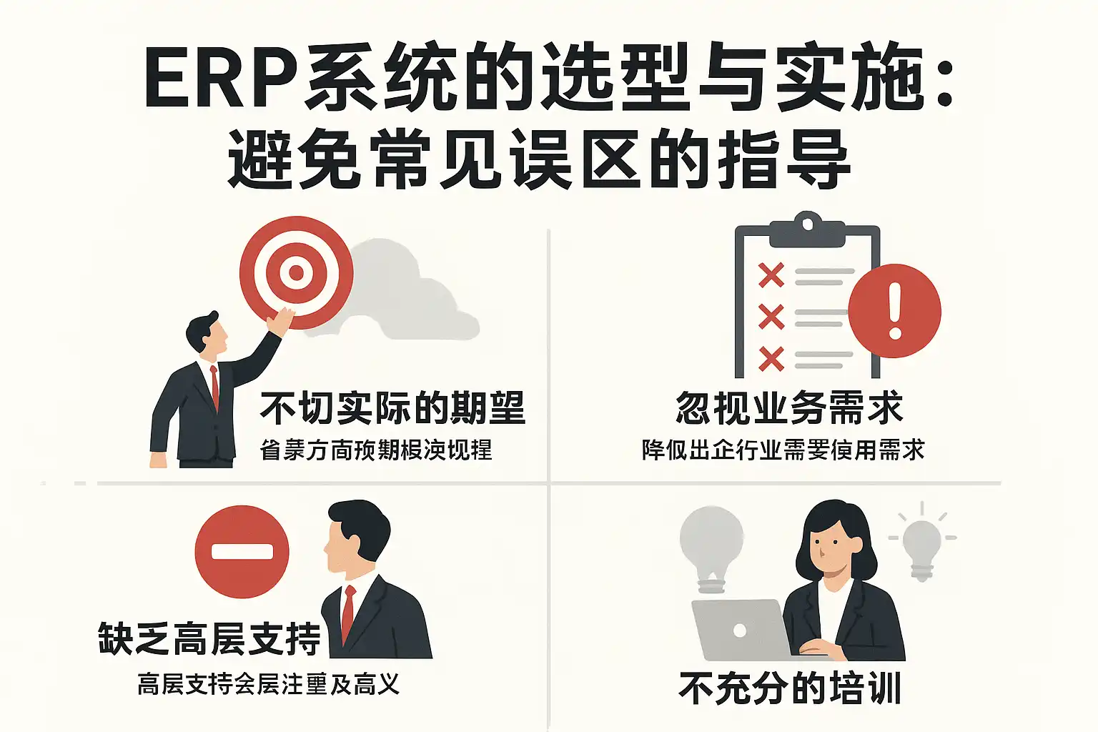 用户培训不足是ERP实施失败的常见原因之一。避免该误区建议: