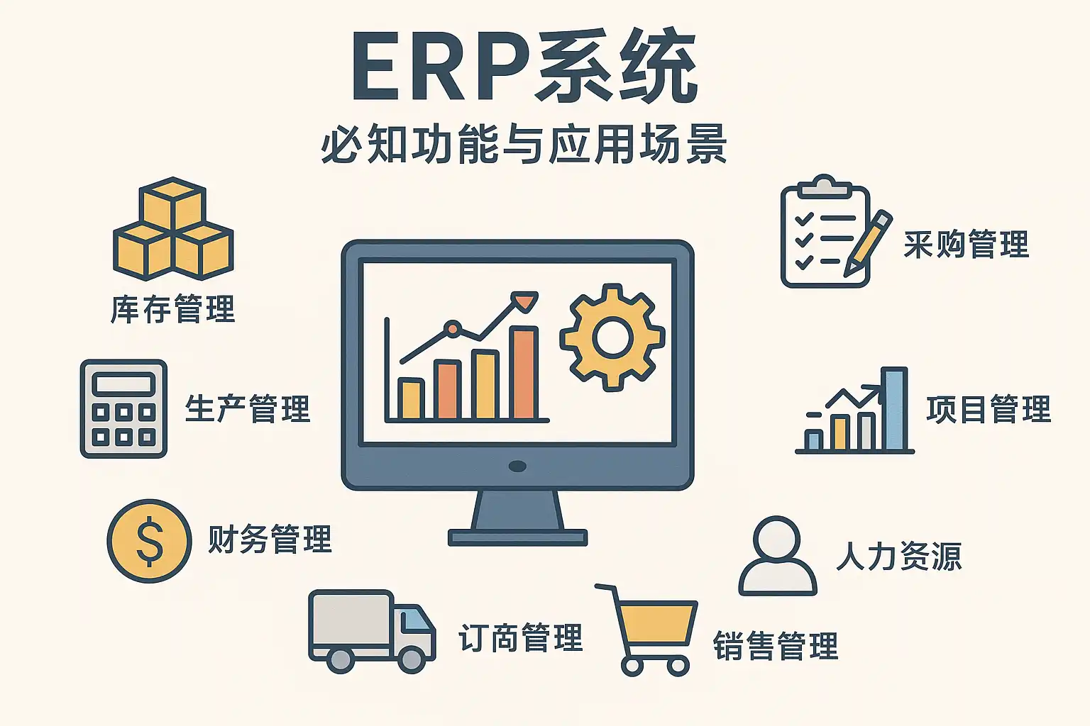 | 销售与订单 | 客户档案、报价/合同、价格与折扣策略、订单校验、交货期承诺、发货对账 | 缩短订单处理时长20%-40%;降低报价误差 | B2B批发、定制化生产、项目型销售 |
