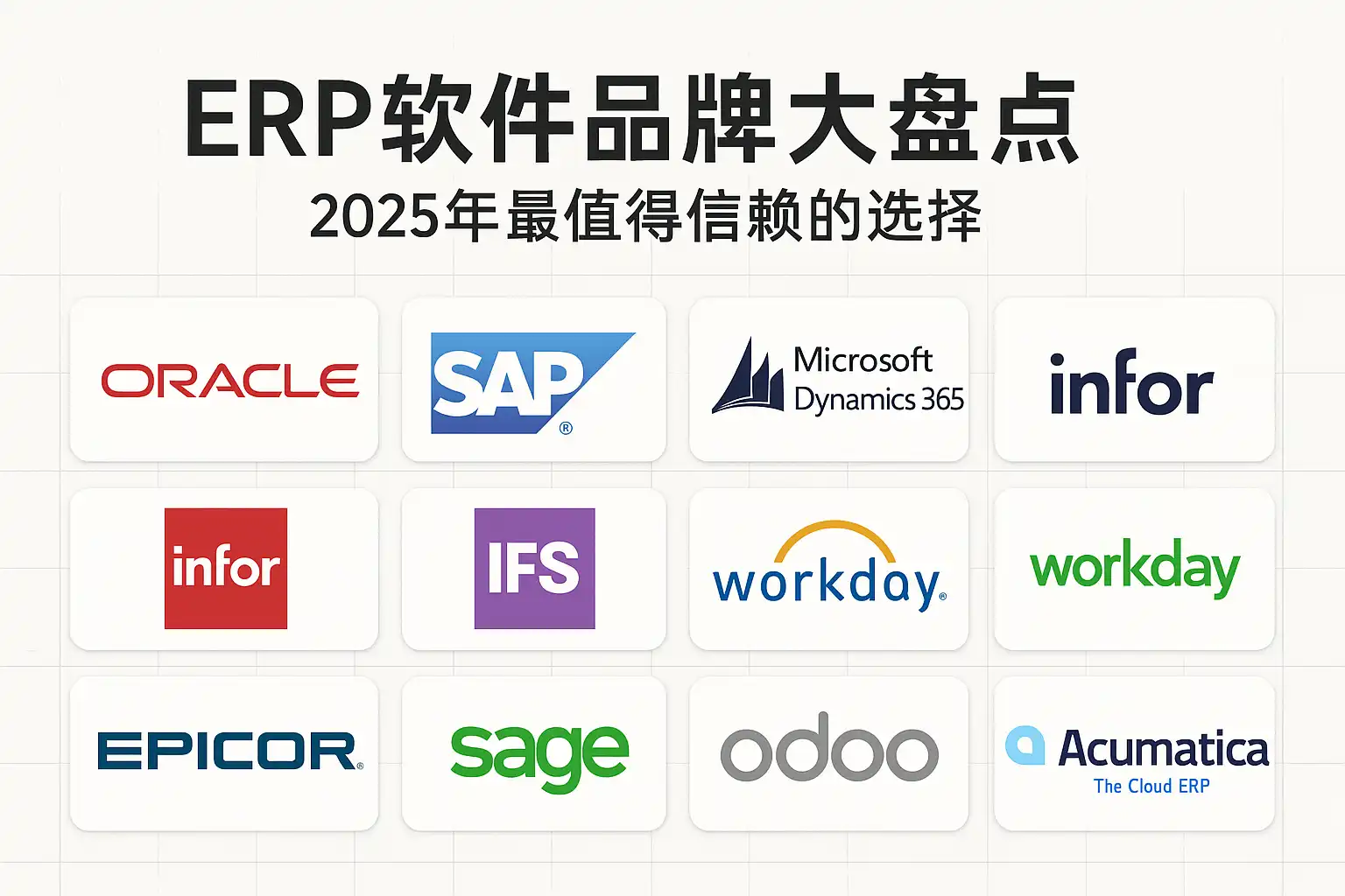 - 全球旗舰(复杂集团):SAP、Oracle、Microsoft、IFS、Infor