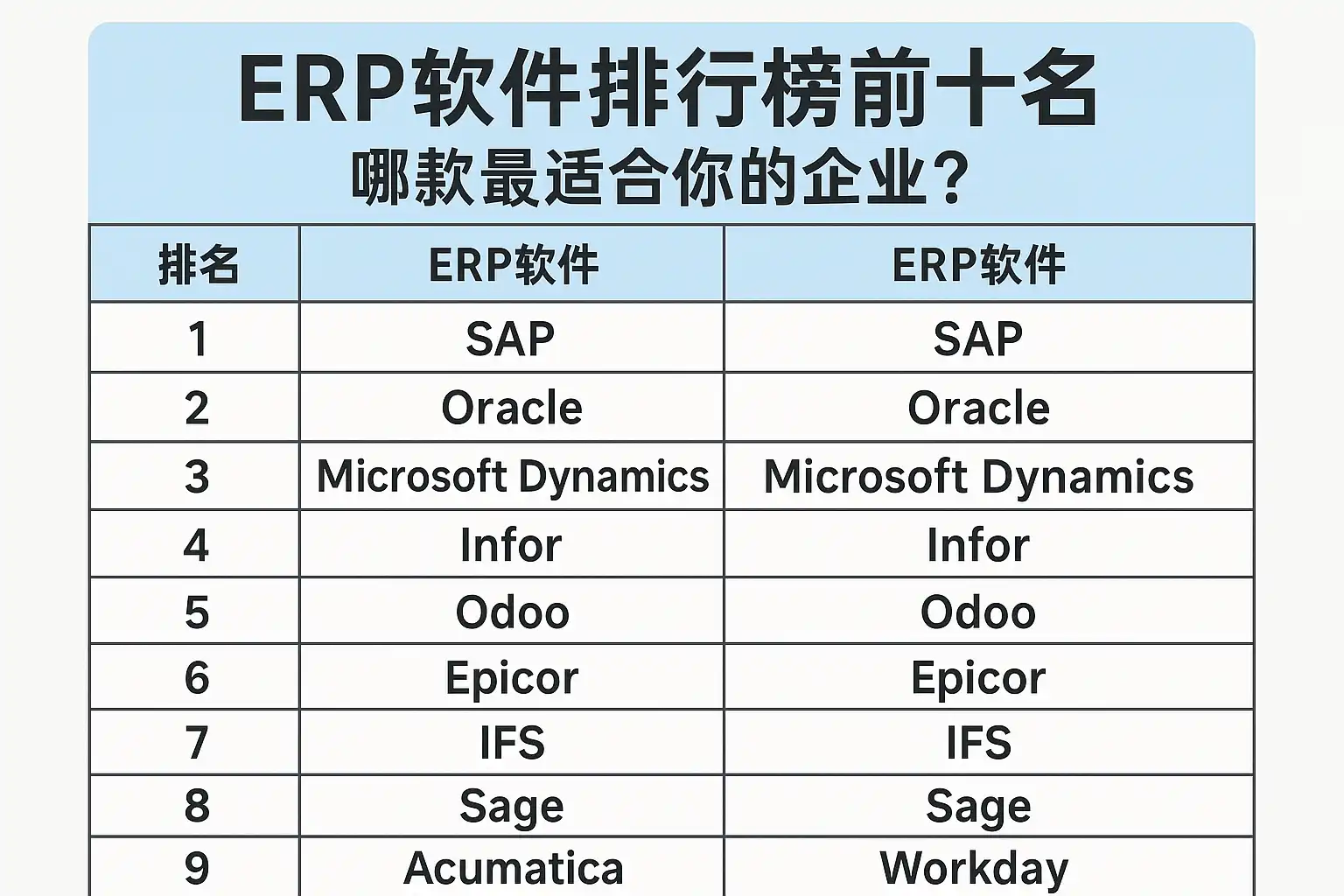 ERP软件排行榜前十名通常包括SAP、Oracle NetSuite、Microsoft Dynamics 365、Odoo、Infor、Epicor、Sage Intacct、Workday、Acumatica和IFS。不同企业类型适合的软件如下: