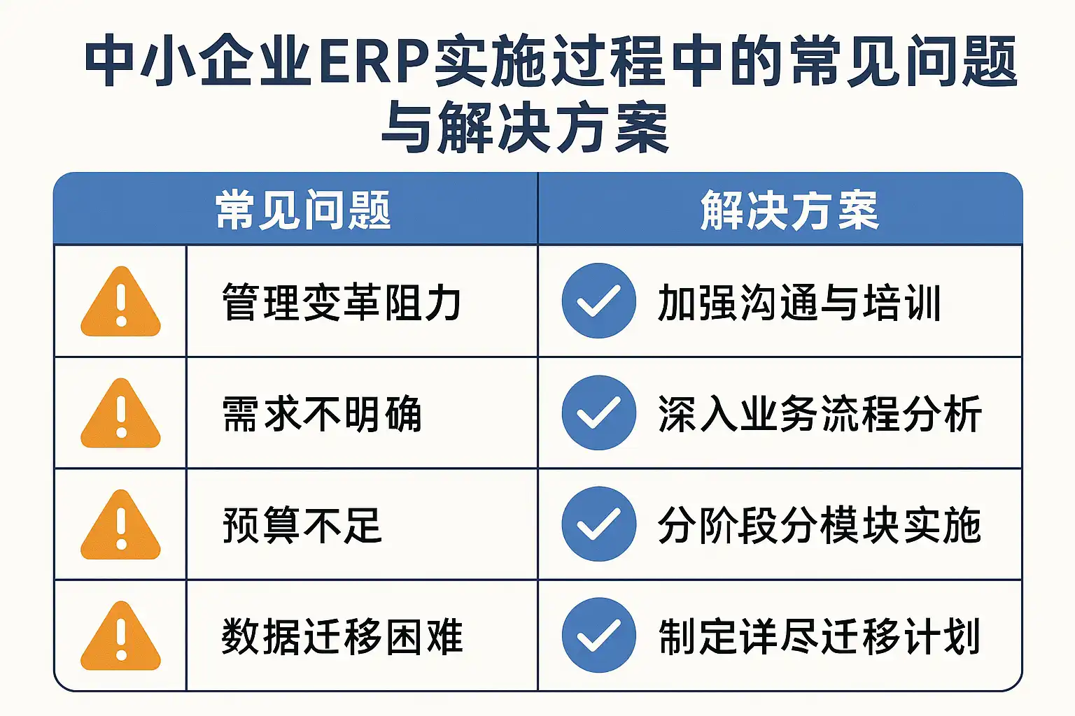 在中小企业ERP实施过程中,常见问题包括需求不明确、员工抵触变革、数据迁移困难以及供应商选择不当。为有效规避这些问题,建议采取以下措施: